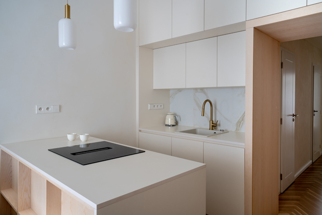 Skromné prostorové možnosti vedly k důsledné práci s barevností i materiály. Zásadním přístupem architektů bylo byt prosvětlit a opticky zvětšit, a proto je celý interiér laděný do světlých, přírodních tónů, které zároveň koncepčně propojují jeho jednotlivé části do harmonického celku. „Obytné místnosti jsou propojené dřevěnou lepenou podlahou v lehce běleném odstínu, která nejenže prostor prosvětluje, ale zároveň díky kladení do parketového vzoru odkazuje k historickému charakteru budovy. Dominantními materiály na nábytku jsou pak bělená jasanová dýha a jemné krémové odstíny,“ dodává architektka Linda Polomová. Tyto prvky jsou patrné už při vstupu do bytu. Původní tmavá a nevyužitá vstupní chodba představovala typický problém malých bytů – plochu, která zabírá místo, ale neslouží. Architekti zde proto navrhli světlý vestavěný truhlářský nábytek, který místnost zútulnil a zároveň jí poskytl praktický úložný prostor. Tento prvek navíc vizuálně navazuje na kuchyňskou linku a plynule propojuje vstupní část s obytnou zónou, čímž podporuje plynulost celé dispozice.