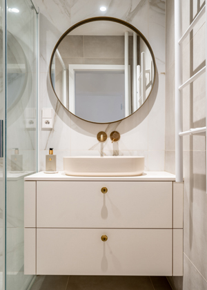 Poslední místností karlínského bytu je koupelna, která po náročném dni nabízí prostor pro tělesnou i duševní očistu. Na přání klientů v ní byla původní vana nahrazena sprchovým koutem, což se vzhledem k (ne)velikosti místnosti ukázalo jako ideální řešení. Díky tomu vznikl prostor pro další vybavení a úložné místo. Interiér koupelny opět pracuje s čistými liniemi a kvalitními materiály, jako zdobný prvek jsou zde využity mosazné baterie a úchytky zásuvek. „Mosaznými detaily jsme se snažili celému bytu vdechnout trochu původní atmosféry. Využili jsme je napříč interiérem nejen pro vodovodní baterie a úchytky nábytkových dvířek, ale dokonce i na monturách svítidel,“ dodává architekt Martin Kříž.