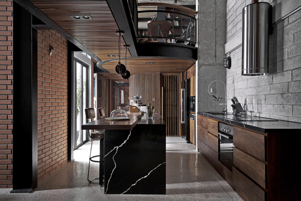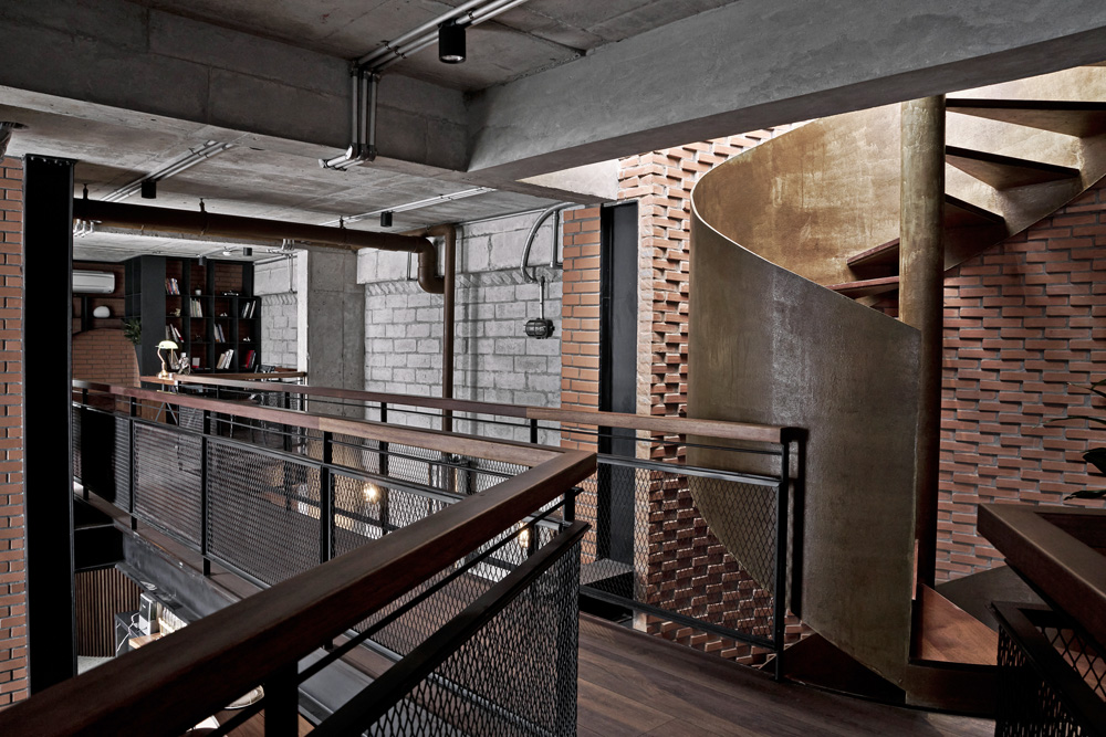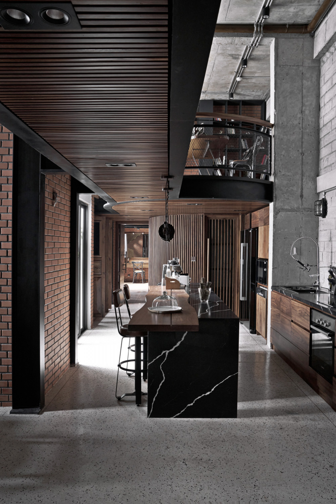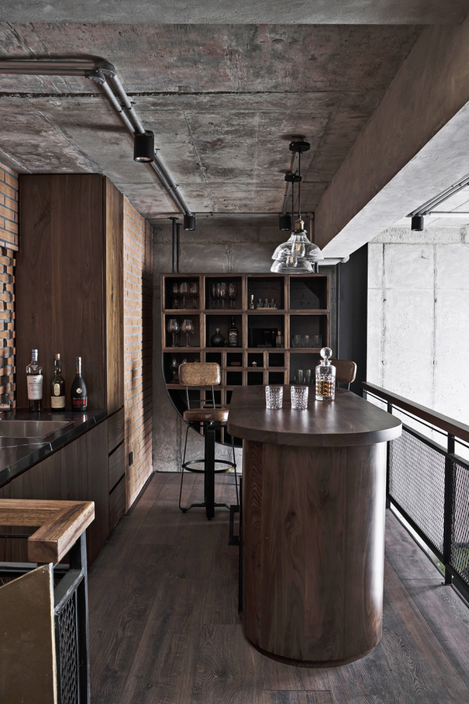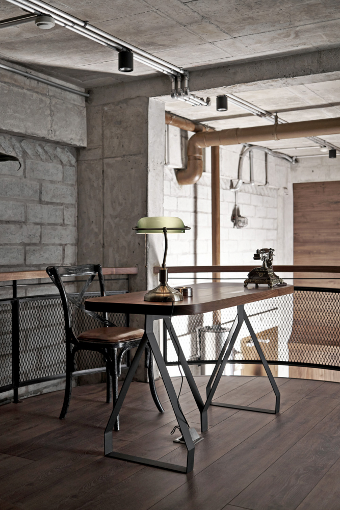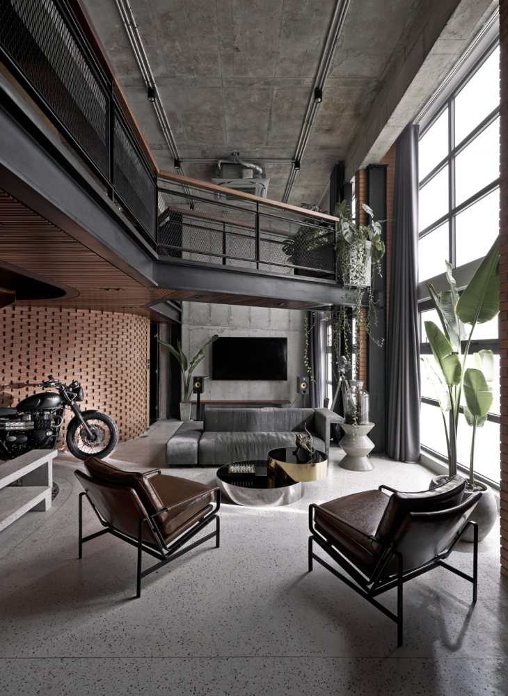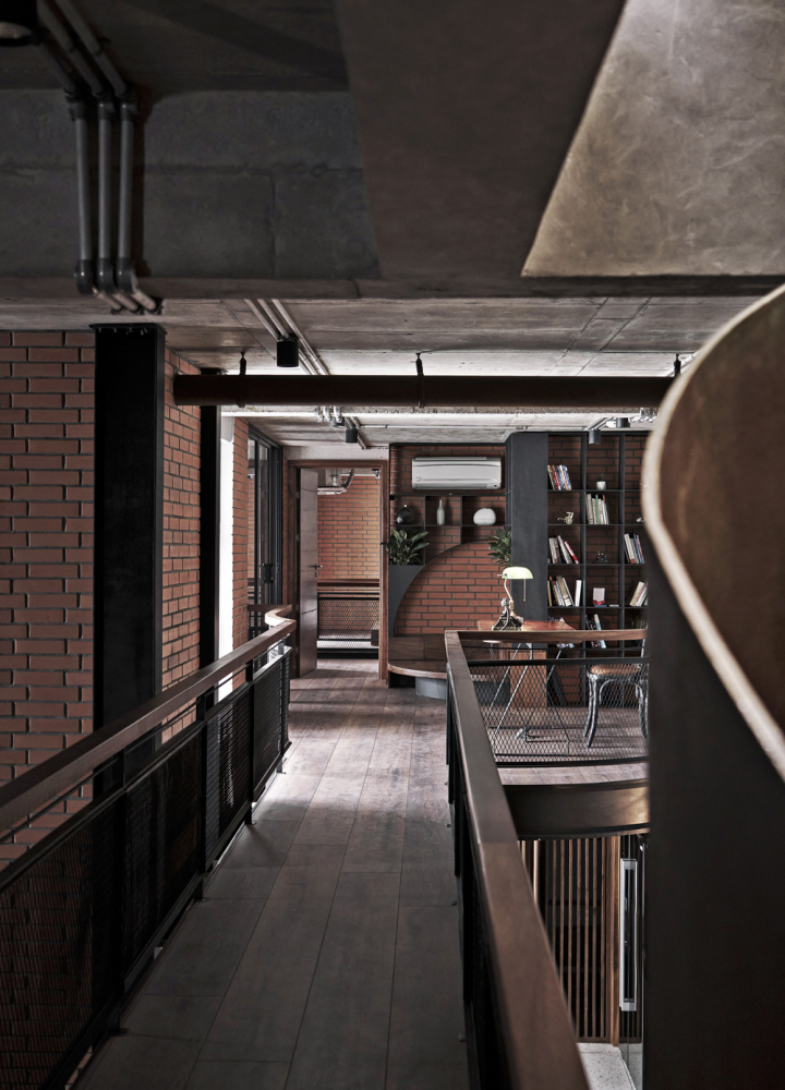 Kromě nekompromisně industriálního stylu, enormně vysokého stropu a masivní ocelové vestavby tento dojem podporují také použité materiály, které si majitel bytu může užít ve vší jejich surovosti. Rozměrné betonové plochy střídají velkoplošná skleněná okna i cihlové stěny. V detailech se pak architekti studia spoléhali na dřevo, kůži a (rezavějící) plechové plotny. Vše v dokonalém souladu.