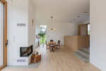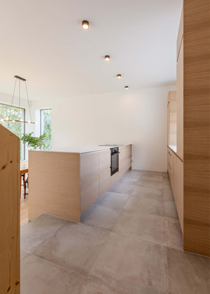Kuchyň, navazující na chodbu, výhledem z okna směřuje ke vstupní a příjezdové části pozemku. Zařízena je minimalisticky a jedno ze dvou protilehlých lineárních ramen kuchyňské linky je umístěno do prostoru, čímž kuchyň opticky propojuje s jídelnou. Celá obývací část je výškově snížena. V jejím středu dominuje krb, který vizuálně odděluje jídelní kout od zbytku místnosti. Z prostoru obývacího pokoje je HS portálem přístupná přilehlá terasa.