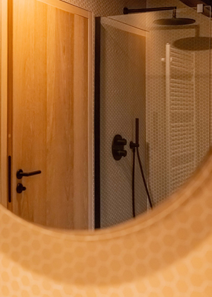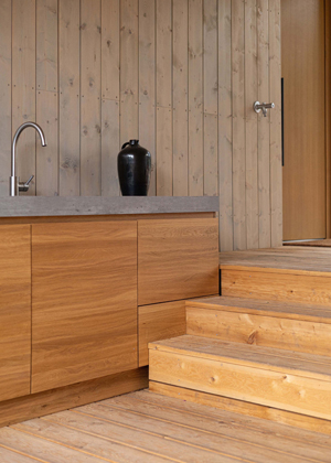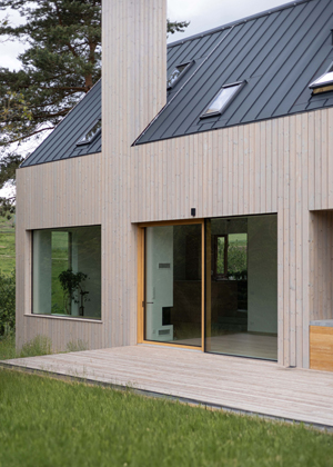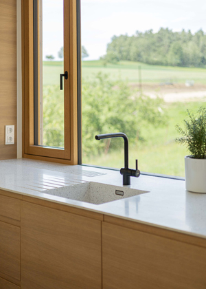 Celému prostoru domu, vně i uvnitř, dominuje dřevo v kombinaci s bílými doplňky, betonem a černými akcenty v podobě vodovodních baterií, světel a dveřního i okenního kování. „Všechny dveře i okna jsme se rozhodli vybavit klikami v černém provedení, a to nám umožnil sortiment českého výrobce M&T, s jehož produkty máme dlouhodobou pozitivní zkušenost z realizovaných projektů. Zvolili jsme kliky Lusy v povrchové úpravě titan černý mat, které působí subtilně a elegantně. Modelová řada navíc zahrnuje také dlouhou kliku pro HS portál, takže nám umožnila pohledově sladit kování v celé realizaci,“ říká architekt Šťastný, který u značky M&T navíc oceňuje, že se jedná o lokální českou výrobu. Roman Ulich, hlavní designér rodinné manufaktury M&T, pak architekta doplňuje s informacemi k samotnému povrchu: „Zvolený povrch titan černý mat vyniká nejen estetickými přednostmi, ale také těmi praktickými. Nejedná se totiž o klasický barevný nástřik – kování je pokryto skutečnou tenkou kovovou vrstvou, která mu dodává vysokou odolnost vůči otěru a poškrábání.“