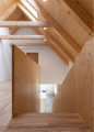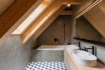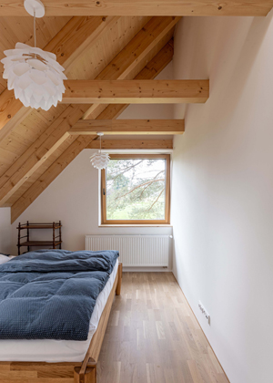 V podkroví domu, které v celé své délce slouží potřebám mladé rodiny, se nachází světle laděná ložnice a pokoj pro hosty. Samozřejmostí je přilehlá prostorná koupelna s vanou a dvěma umyvadly. Současně v podkroví vznikl prostor pro pracovnu a šatnu. Nechybí také dva velkorysé dětské pokoje s další samostatnou koupelnou. Důležitým a praktickým detailem v obou koupelnách je využívání zachycené dešťové vody pro vnitřní potřeby splachování. Ve všech podkrovních pokojích jsou dominantou přiznané stropní trámy dodávající modernímu domu na rustikálnosti.