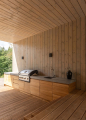 Materiálově shodně je laděná i druhá část domu, kterou obývají rodiče jednoho z majitelů. Ta je přístupná vchodem z příjezdové části pozemku. I přestože vznikla z původní staré části stavby, získala moderní dispozice a je zařízena prakticky a účelně, s dostatečným prostorem. Obytná jednotka disponuje praktickým zádveřím, z kterého je přístupná koupelna s vanou a také samostatná toaleta. „Z chodby se vchází do centrálního společenského prostoru spojujícího kuchyňský kout, jídelnu i obývací část. Je odtud také praktický přístup na samostatnou terasu navazující k domu. Z obývacího pokoje se pak vchází do ložnice prarodičů,“ popisuje architekt Šťastný na závěr i druhou část domu.