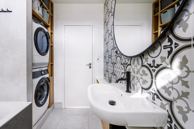 S původními koupelnami nebyli majitelé už dlouho spokojeni. Nevyhovovalo jim zařízení, řešení ani styl. Zatímco v koupelně rodičů bylo jedno umyvadlo, malý sprchový kout a pračka se sušičkou, ve druhé pro děti byla vana i kout, který se ale skoro nevyužíval. Od nové koupelny umístěné u ložnice očekávali manželé více intimní atmosféry a komfortu. Proto tu už nechtěli pračku, ale naopak dvě umyvadla a mnohem prostornější sprchový kout. Součástí zadání pro návrháře bylo i přání, aby koupelny stylově navázaly na jednoduché a moderní zařízení nově zařízené části domu, ve které převažuje šedá barva oživená černými předměty a dřevem. Když architekt Jindřich Kobr hledal prvek, který bude novým koupelnám dominovat, rozhodl se pro obklad stěny s výrazným patchworkovým dekorem. „Záměrně jsem tyto dlaždice použil jen na stěny, protože na podlaze by už celý interiér posunuly do retro podoby,“ říká návrhář. „V omezeném množství na stěně ale naopak působí jako moderní tapeta.“ Výrazný obklad skvěle doplňuje jednoduchá velkoformátová dlažba imitující šedý beton, která je použitá na zbývajících stěnách i na podlaze. Stejně jako v obytné kuchyni posloužily v koupelnách pro efektní kontrast černé armatury a další doplňky, s nimiž koresponduje i černá barva v dekoru obkladu.