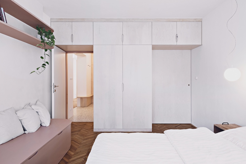 Jednotlivé prostory v prosvětleném bytě důmyslně propojují použité materiály – příkladem za všechny je březové dřevo, které se autorky interiéru rozhodly využít jak na vestavném a solitérním nábytku, tak i na dveřích. V druhé řadě pak propojení poskytuje pastelově růžová barva, která ozdobila stacionární technické vybavení domácnosti – radiátory, stoupačky, zámečnické prvky a k tomu i povrchy vybraných kusů nábytku.