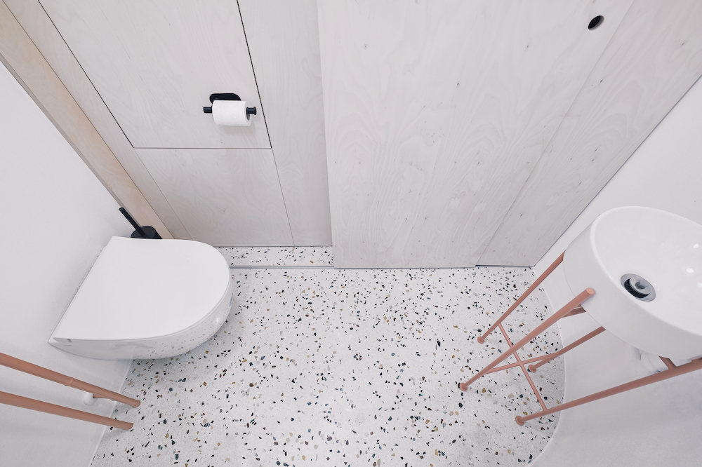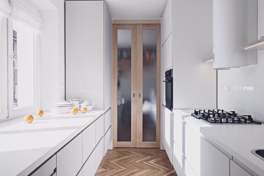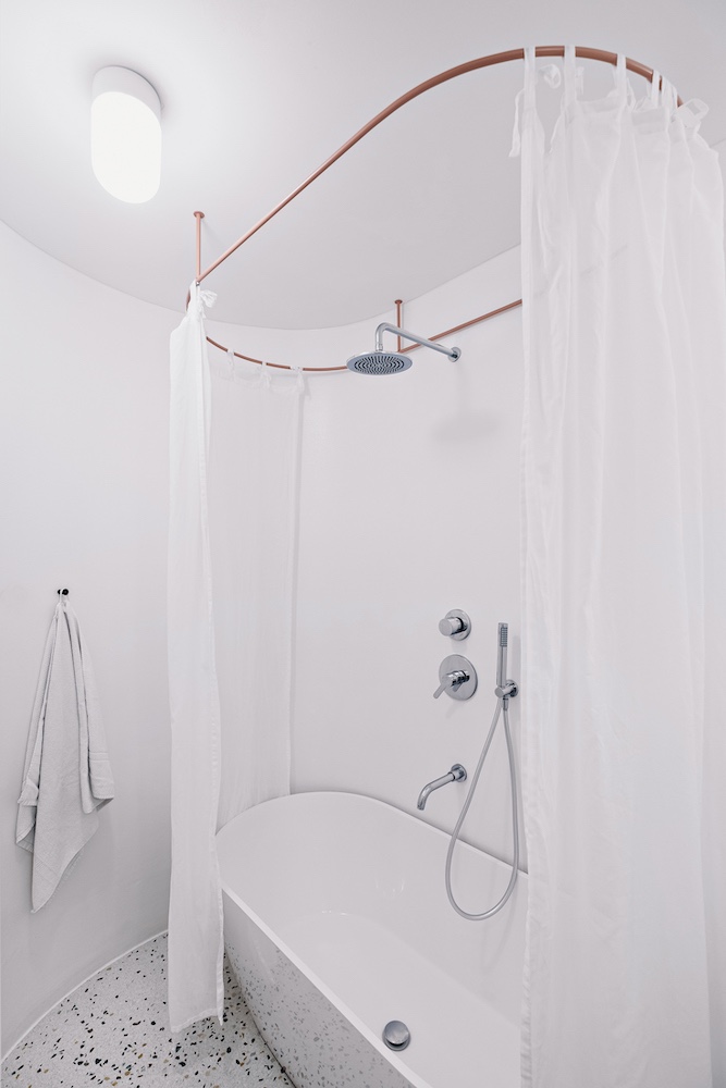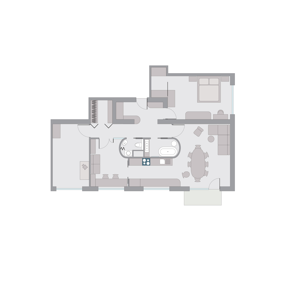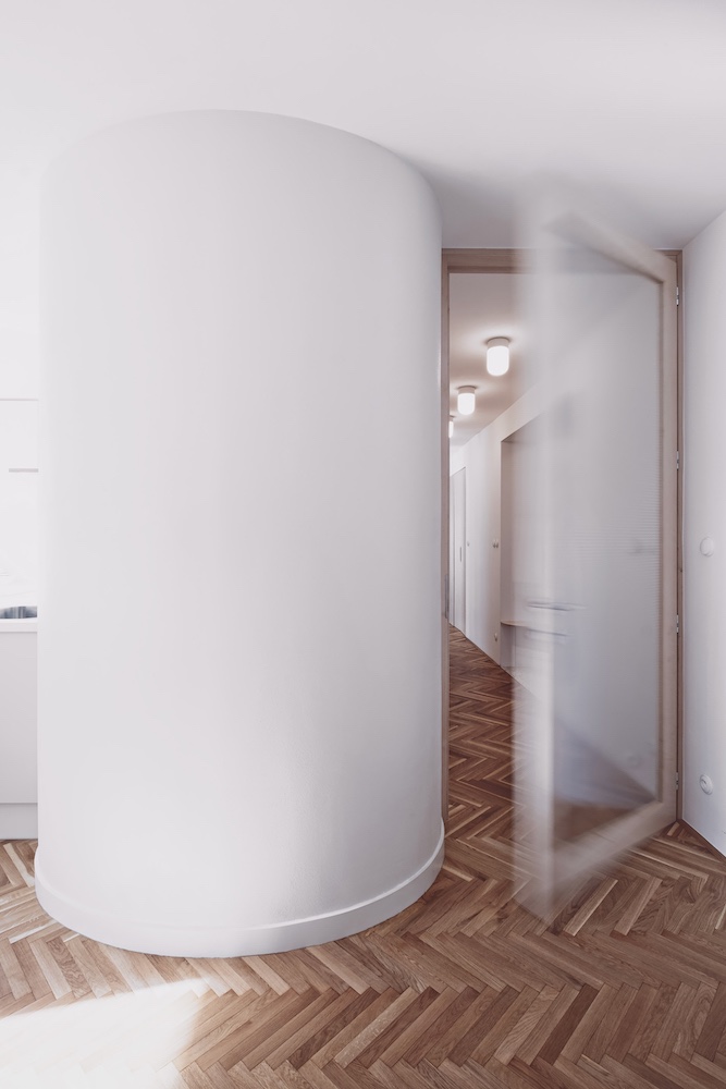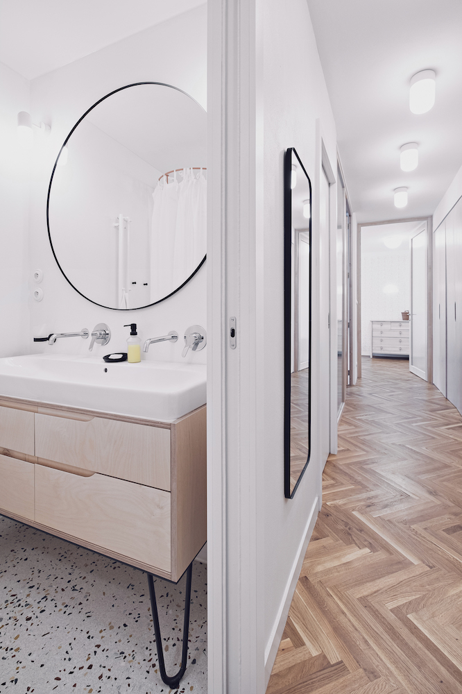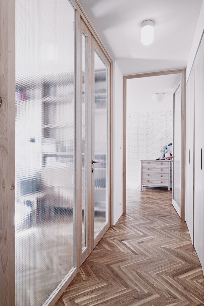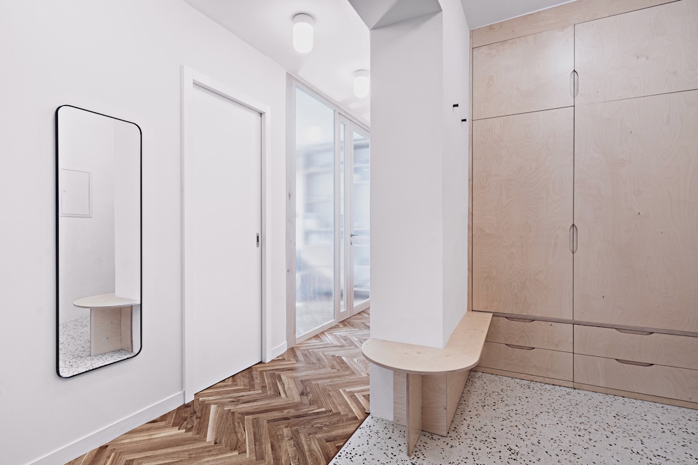 Když došlo na realizaci, postup byl jasný. „V první řadě jsme byt dispozičně očistily o vnitřní jádro – vytvořily jsme jeden velký prostor, do jehož středu jsme vložily dominantní oválný modul skrývající koupelnu a toaletu s pračkou. Zbylou plochu centrálního prostoru jsme rozdělily prosklenými dveřmi, což nám umožnilo zachovat dojem otevřeného prostoru, a přitom ponechat možnost propojení i oddělení všech místností,“ popsala Karolína Röschl. Využití prosklených příček navíc umožnilo dostat přirozené denní světlo skutečně do celého bytu, a to včetně chodeb, které byly původně velmi tmavé. V novém interiéru dostaly příležitost vyniknout povrchy. Podlahy tvoří kombinace repasovaných i nových dubových vlýsků a terazza. Nábytek se může pochlubit povrchy z březové překližky, masivního buku a na pohled i na dotek velmi příjemných textilií. Stěny pak zdobí válečková výmalba, kterou střídá dokonale hladký povrch oválného bytového jádra.