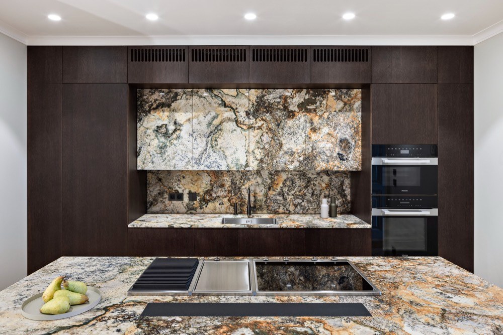 Náročná rekonstrukce upravila dispozici bytu tak, aby byl pomyslně rozdělen na denní a noční část. První jmenovanou otevírá kuchyň s obývacím pokojem a přilehlá toaleta pro návštěvy. Ráz minimalisticky elegantní kuchyně udává výrazná kresba přírodního kamene přivezeného z Brazílie. Víc dekorativních prvků netřeba. Stylovým doplňkem je koneckonců i vestavná vinotéka nebo domácí kulinářské pochoutky, které vznikají v kombinovaném varném centru na ostrůvku. S kuchyní je volně propojený obývací pokoj s krbem. Kamenný obklad na něm je opět natolik výrazný, že nepotřebuje žádné „katalyzátory“, ani pokud jde o barevnou paletu, ani co se zařizovacích předmětů týká. Výjimkou jsou snad jen svítidla Soap od značky Bomma, která si však s krbem nekonkurují. Naopak svým křišťálovým, lehce metalickým povrchem přátelsky zrcadlí barevné schéma tohoto prostoru.