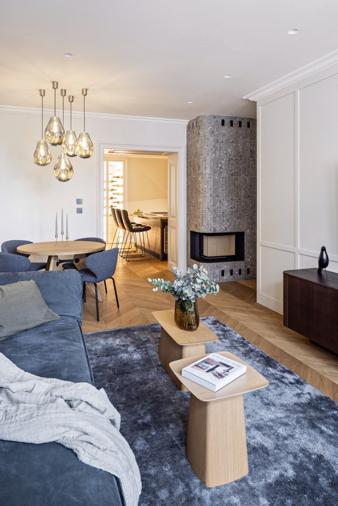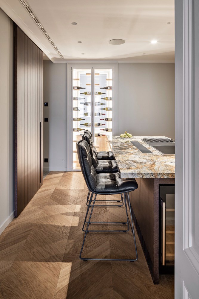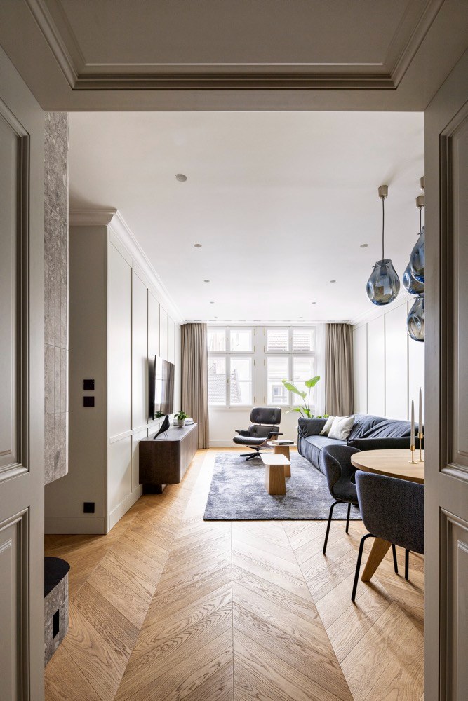 Majitelé bratislavského bytu tráví většinu roku na cestách, a možná právě proto očekávají od svého nového bydlení maximum z maxima. Od designového konceptu přes řemeslné zpracování až po praktickou stránku bytu. Architekty ze studia arkhe tak čekal nelehký úkol rozčlenit prostor tak, aby poskytl veškeré požadované zázemí: dostatek úložných prostor v každé části bytu, krb, dva dětské pokoje, ložnice s walk-in šatnou, technickou místnost a v neposlední řadě také tři koupelny. „Dispoziční řešení prošlo kompletní proměnou, každý milimetr v bytě má svůj účel. A to i na místech, do kterých byste to neřekli. Úložný prostor a praktičnost při návrhu hrály velkou roli,“ popisuje architekt Ján Antal. Nadto si tým studia arkhe vytknul ještě jeden osobní cíl: citlivě propojit vzhled bytu s historickou lokalitou, v níž se nachází, a vzkřísit pod relikty dob minulých zapomenutého genia loci. Vytvořit zcela organickou symbiózu mezi historizujícími prvky a moderním designem.