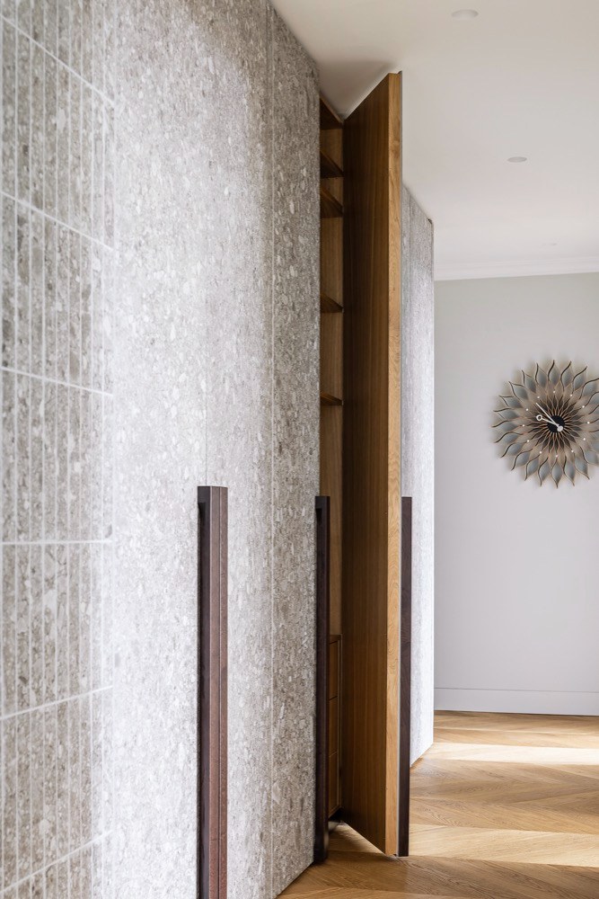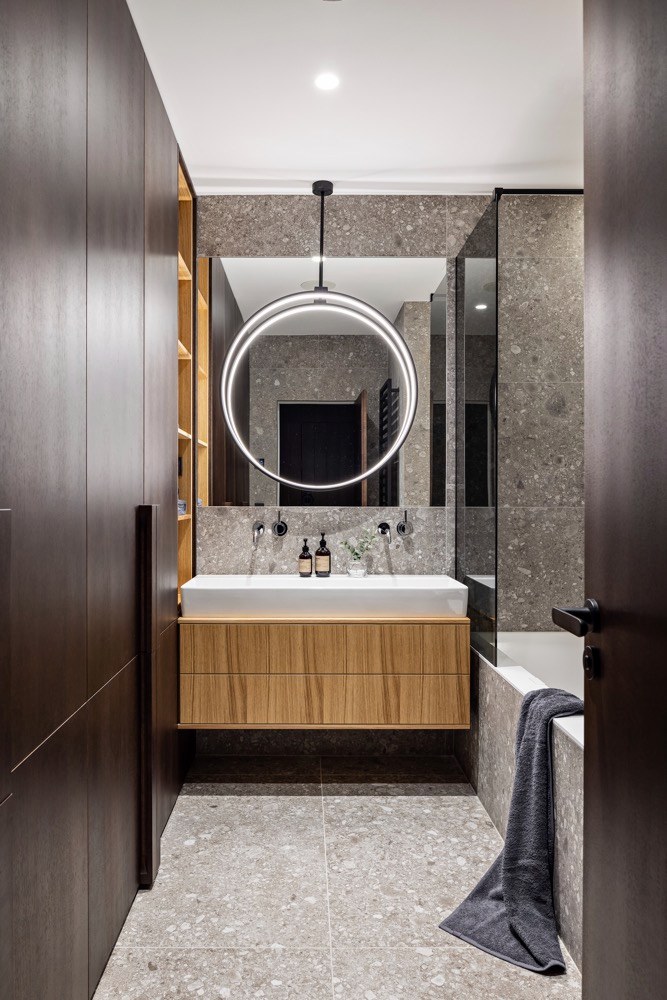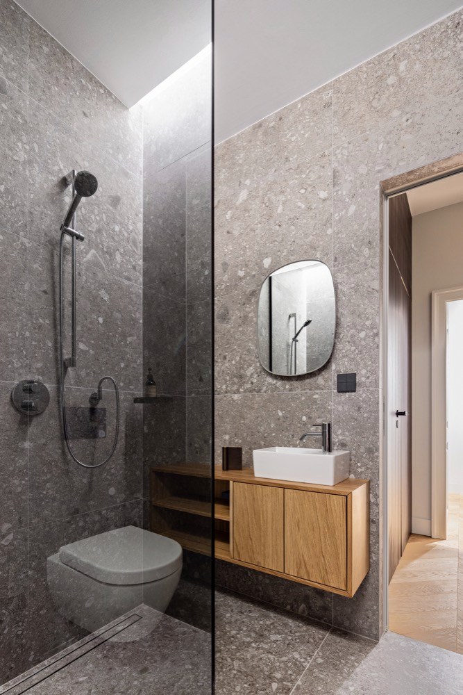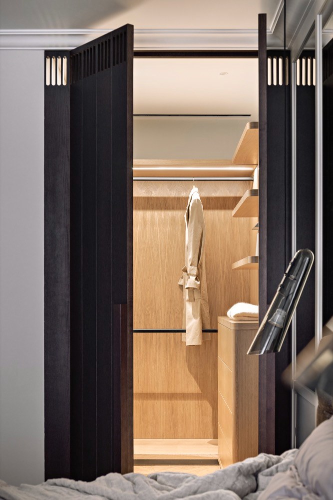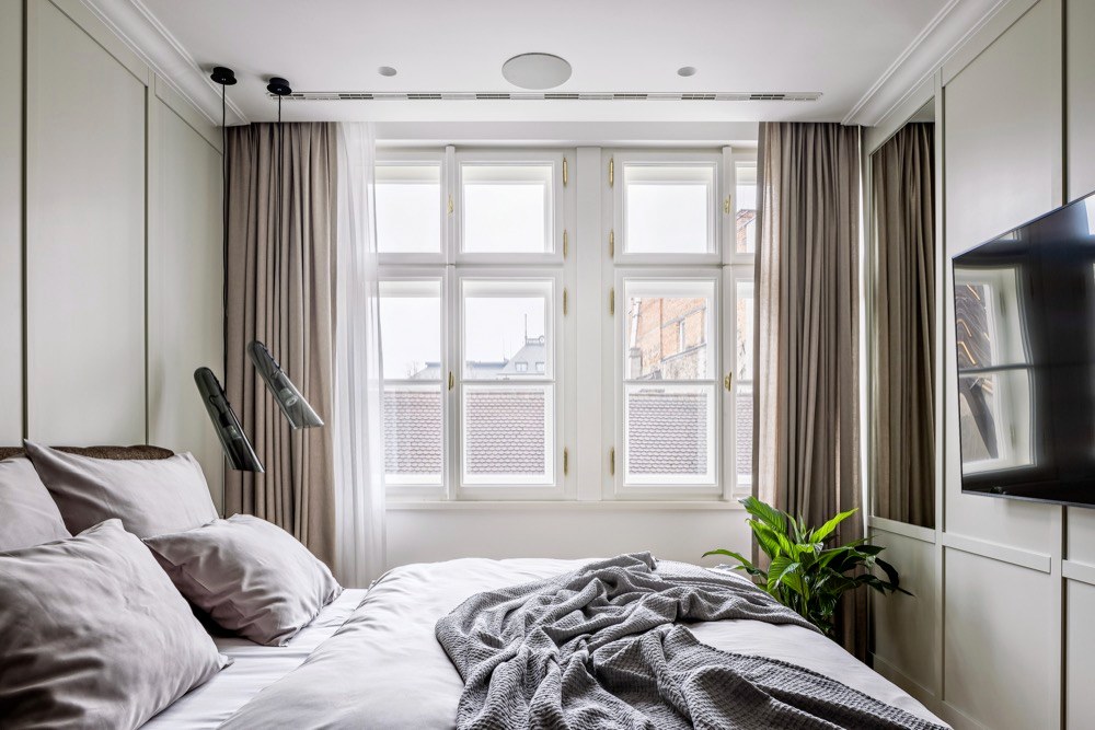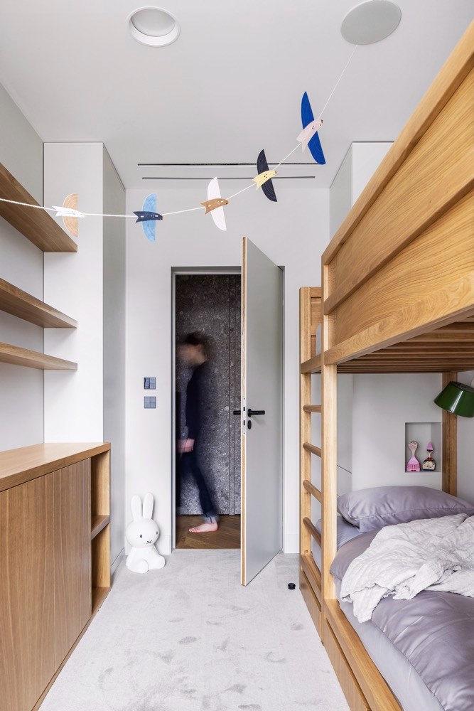 I vzhledem k častému pobytu mimo domov si rodina přála, aby byl byt lehce udržovatelný a ovladatelný. Proto zde najdeme řadu technických vychytávek, které jí ulehčí život. První je vytápění a chlazení interiéru pomocí tepelného čerpadla, jehož rozvody jsou prakticky vedené podél oken a nezasahují tak do vzhledu bytu. Topení, ale i stmívatelné osvětlení nebo motorické závěsy obsluhují majitelé prostřednictvím mobilní aplikace. Stačí jeden dotyk prstem a celý byt se pohrouží do příjemného intimního světla. A když se zapomene zhasnout, není důvod k panice, vše se dá uvést zase do pořádku třeba i z letiště.