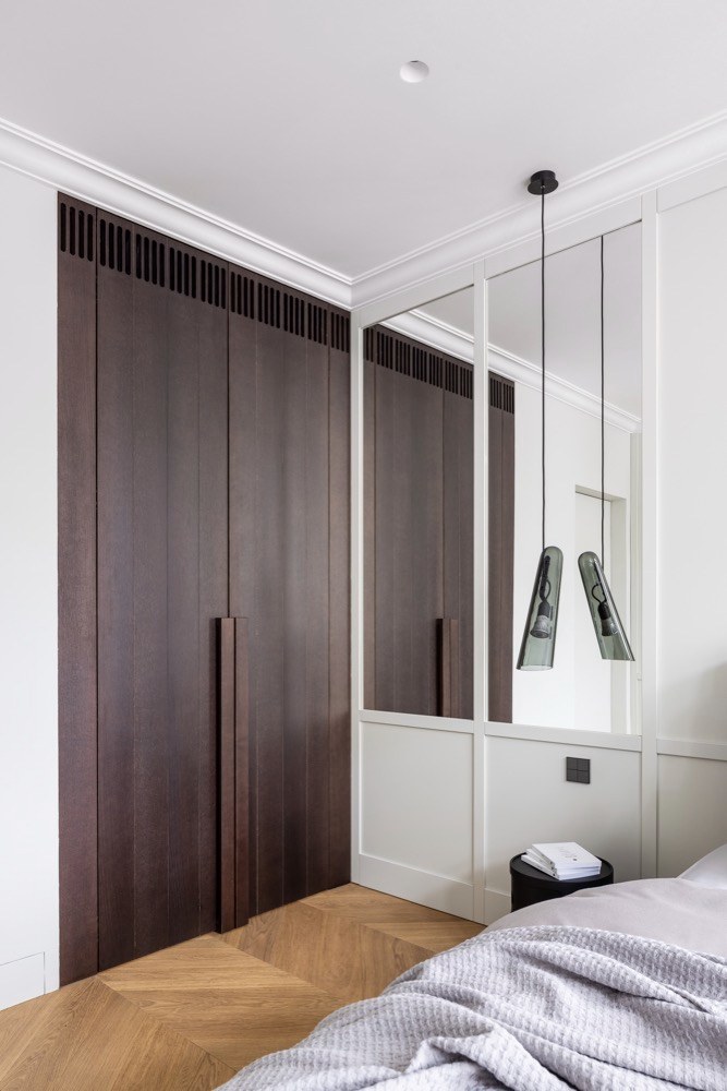 V intimní zóně bytu se nachází rodičovská ložnice, dva dětské pokoje a dvě plnohodnotné koupelny. Noční část bytu je propojena s denní chodbou, která je díky vestavným skříním využita jako jeden velký úložný prostor. Přiléhající dětské pokoje jsou vybavené atypickým nábytkem a jsou řešené veskrze minimalisticky s ohledem na prostor i na rychle se měnící potřeby dětí. Byt uzavírá ložnice rodičů, která vizuálně navazuje na zbytek interiéru použitím kazetového obložení a zrcadel na stěnách. Ta kromě jiného skvěle plní svou funkci iluzionisty, který opticky přidává prostoru na metrech. Praktickým řešením je připojená walk-in šatna a skrytá technická místnost s prádelnou.