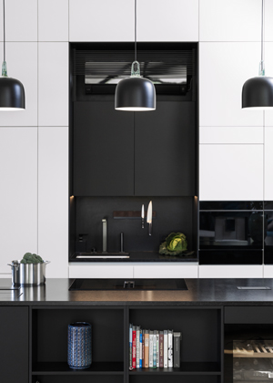 Pro sestavu kuchyně, která je součástí velkého vestavěného bloku, použili strukturovaný lak v odstínu „květnatě bílá“, ostrůvek je v černém matném laku a pracovní deska je z žuly Nero Assoluto. Součástí ostrůvku je také televizor, který je možné v případě potřeby elektronicky vysunout z pracovní desky, případně ho zpět zasunout a skrýt do skříňky.