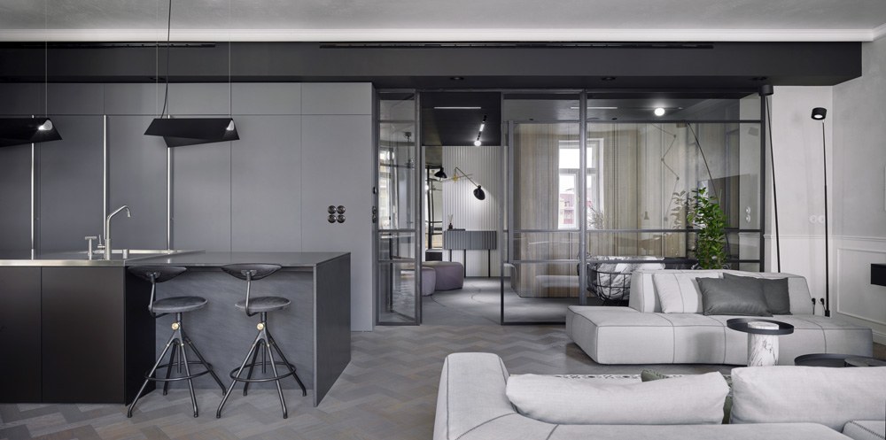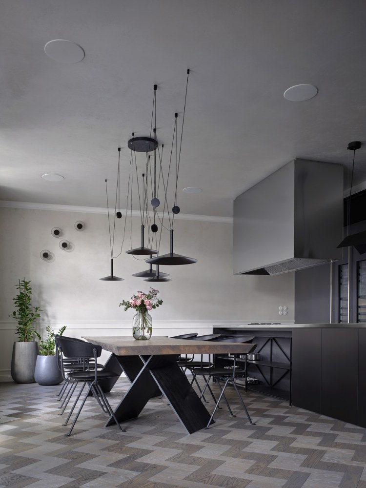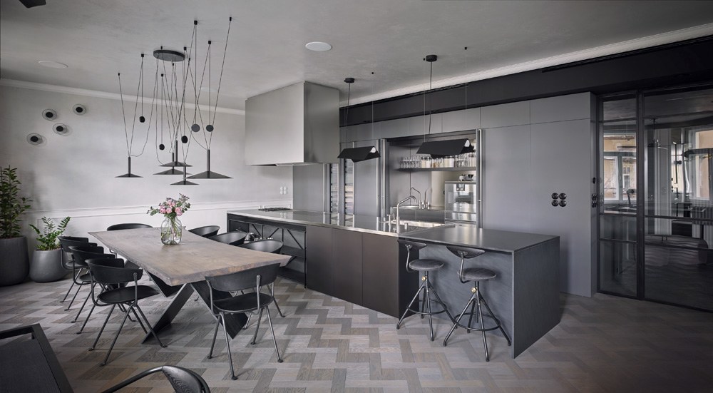 Nejdůležitějším prvkem zde byla od začátku kuchyně, protože investor rád vaří. Velkorysou pracovní plochu i množství úložných prostor poskytuje ostrůvek kombinující nerezové povrchy s hliníkovými dvířky a prvky z kamene. Vysoké skříně jsou vloženy v nice a jejich dvířka přecházejí v obklad stěny navazující na obložení vstupní haly. Součástí je také nika na drobné spotřebiče s další pracovní plochou, po jejímž uzavření tato část kuchyně tvoří kompaktní box, v němž je umístěna i toaleta a dveře do šatny, které jsou ve stejné profilaci jako repliky původních dveří do dalších pokojů. Jídelní stůl pro deset lidí je z jediného kusu masivního dubového dřeva, mořeného do tmavšího odstínu podpíraného skulpturální podnoží z hrubé oceli. Dekor dřevěné podlahy použité na téměř celé ploše bytu vychází z původních parket, jejichž rozměr byl zvětšen a atypicky poskládán. Stěny i strop v hlavní obytné části pokrývá jemná stěrka, která se strukturou podobá staré omítce a doplněna je o zdobné fabiony. Betonovou stěrku použitou na podlaze vstupní haly ozvláštňuje zlatá linka, odkazující na estetiku starých pražských bytů.