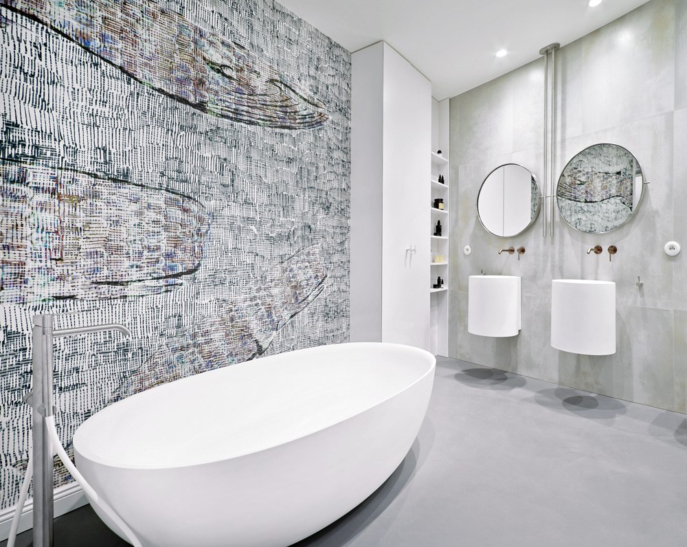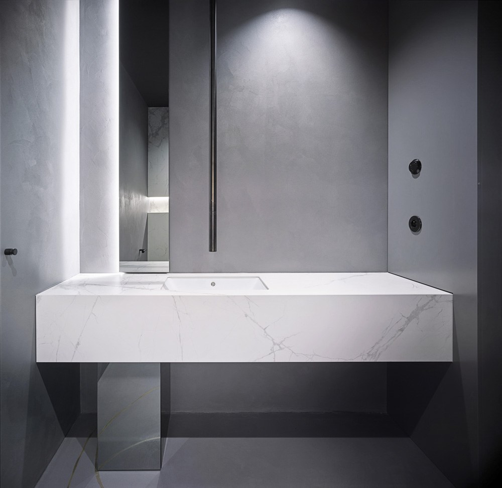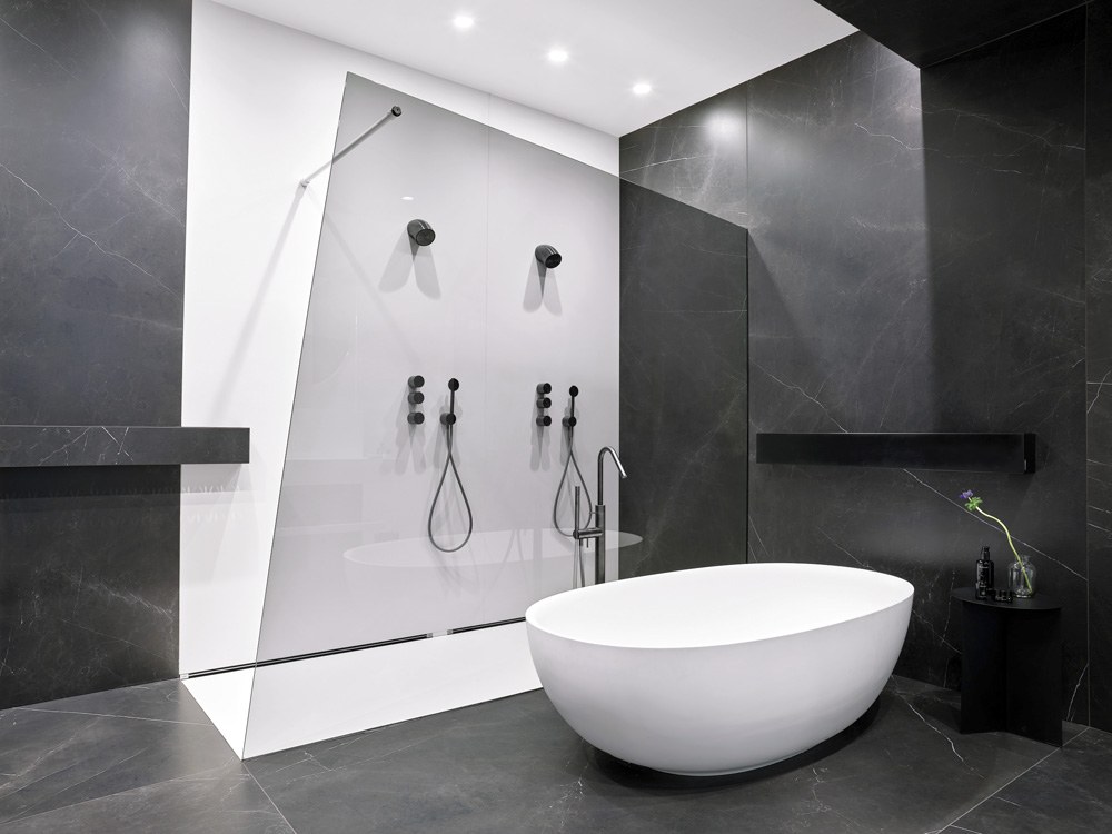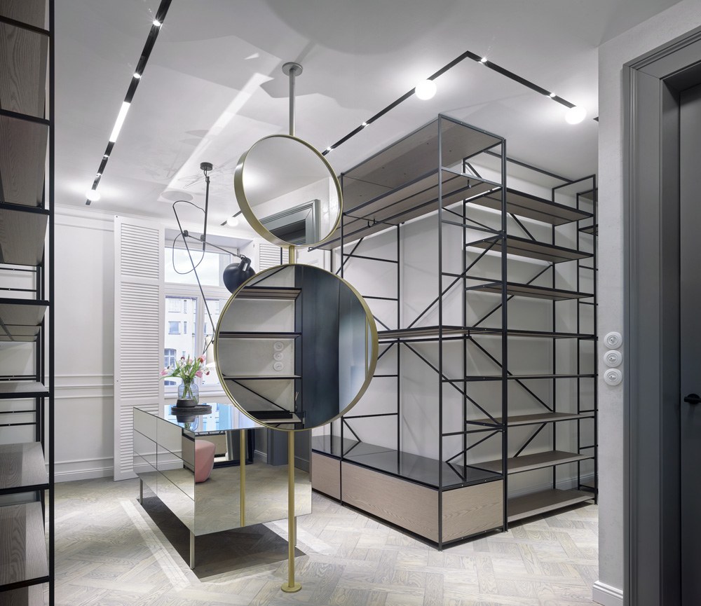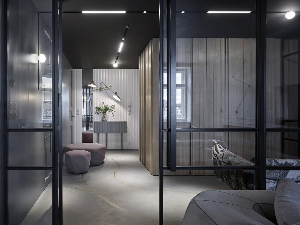Projekt vznikl spojením dvou bytových jednotek: „I když staré vinohradské byty bývají poměrně velkorysé, tak jsme samozřejmě do konstrukcí zasahovat museli. Společně se statikem se nám ale podařilo dosáhnout přesně takového rozložení, jaké si klient přál,“ popisuje Ing. arch. Klára Valová samotný počátek realizace. Investor se studiem SMLXL spolupracuje už několik let na různých projektech, takže jeho rukopis dobře zná: „Při prezentaci hlavního konceptu jsme si prakticky na první dobrou sedli a on nám pak už nechal téměř volnou ruku. Věděli jsme, že klient se stejně jako my nebojí tmavších odstínů, tak jsme toho využili. Tmavá vstupní hala například podpoří světlost hlavní obytné místnosti, tmavá koupelna je za mě zase ideální pro relax a umožní vyniknout solitérním prvkům, jako je vana a umyvadlo.“