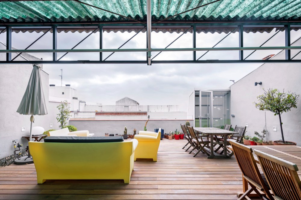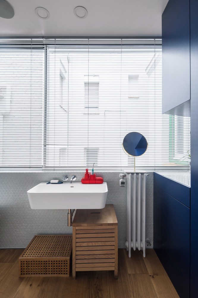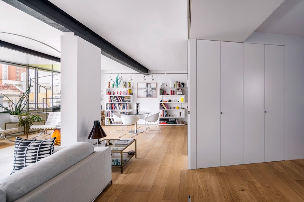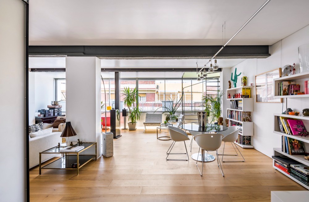 Celkovou otevřenost byt získává i díky velkoformátovému oknu, jež se rozprostírá po celé šířce severní fasády domu. Na každý centimetr čtvereční obytné plochy tak díky němu dopadá paprsek světla, které ve zdejším autentickém prostoru hraje svou nezastupitelnou roli. Okno je také možné otevřít, a byt tak rázem proměnit v pomyslný „poloexteriér“.
