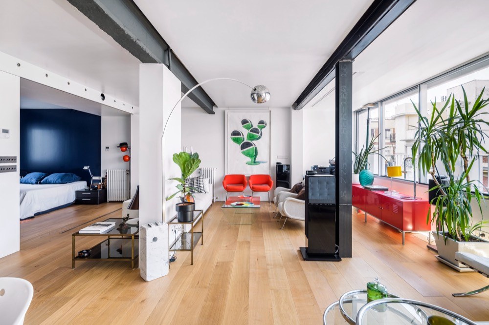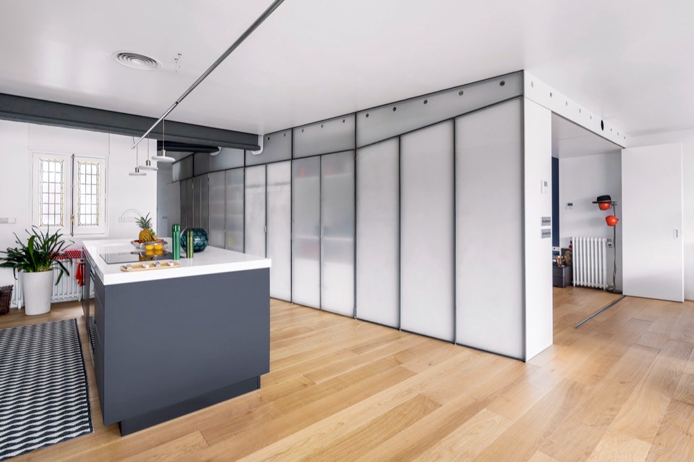 V rámci realizace nebylo primárním zájmem architektky přetvářet stávající stav, naopak. Kladla důraz na otevřenost a propojení jednotlivých obytných zón. Stěnová konstrukce, tvořená primárně z metakrylátu a železa, je společně se schodištěm vedoucím na střešní terasu jediným novým přírůstkem do původní dispozice. Jejich význam je neoddiskutovatelný. Inovátorský přístup k propojení a zároveň případnému časově omezenému rozdělení bytu hraje v interiéru speciální roli. Společně s původními prvky, jako jsou okna s typicky barevným sklem nebo architektkou odhalené původní betonové nosníky, dodávají bydlení mimořádný charakter podržený vzájemným působením použitých materiálů – skla, kovu, betonu i tvrzeného plastu.
