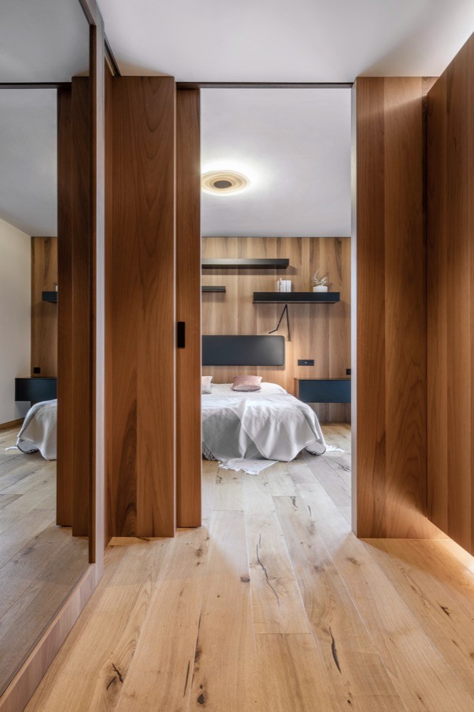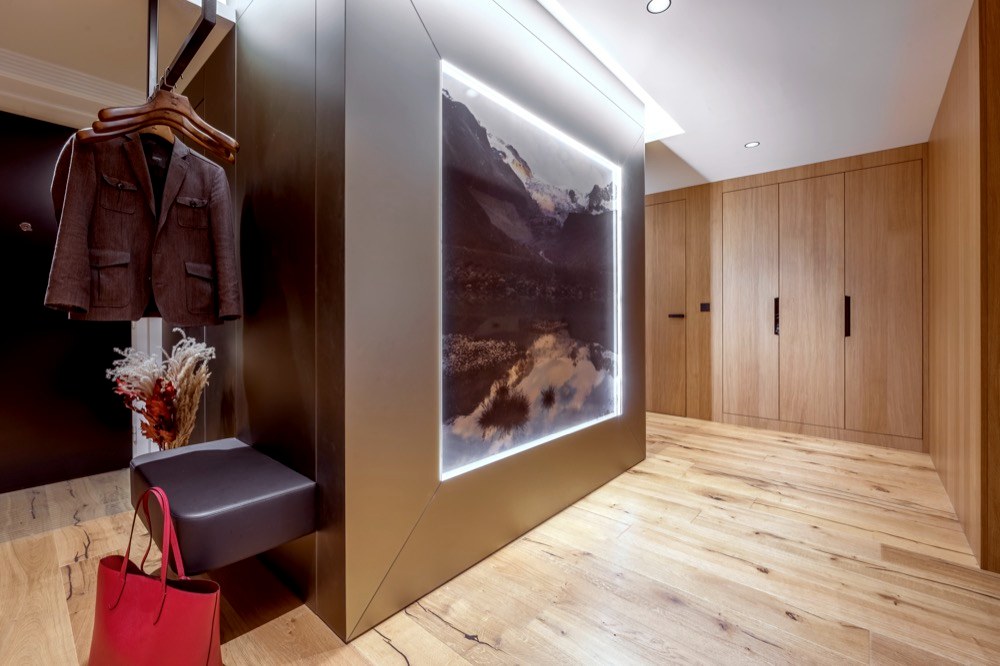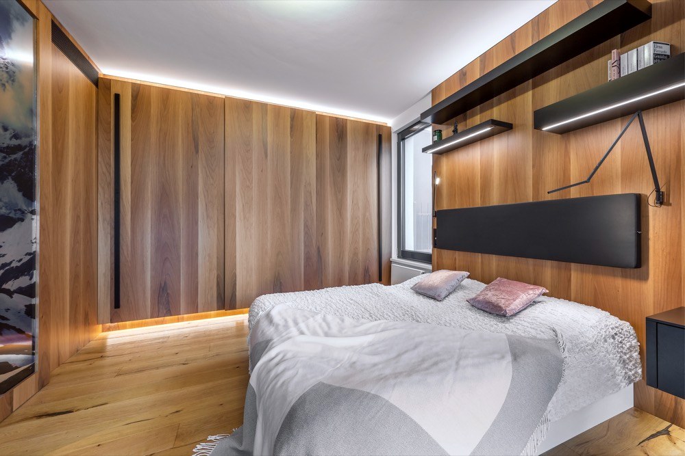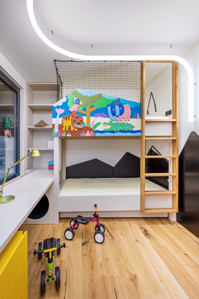 Velkou pozornost autoři interiéru věnovali také dětským pokojům, jejichž koncept se během realizace musel nejzásadněji změnit. Z jediného pokoje se staly dva pokojíčky vzájemně oddělené pouze posuvnými dveřmi se zrcadlem, a nabízejí tak prostorovou flexibilitu v závislosti na náladě jednotlivých ratolestí. O porci soukromí se v obou dětských místnostech starají patrové postele s přiléhajícími boxy, jež slouží jako hravá prolézačka či bunkr. „V dětských pokojích jsme se snažili citlivě pracovat s barevností. Středobodem každého z nich je pestrobarevné zábradlí poschoďové postele, které skvěle funguje s umírněnou béžovou a černými detaily. Veselé motivy na zábradlí pro nás vytvořil pan malíř Rudolf Brančovský,“ prozradil s úsměvem architekt. Nejedná se přitom zdaleka jen o obraz. „Jednotlivé motivy jsou upevněny na magnetech – děti si s nimi mohou libovolně hrát a pak je zase vrátit na zábradlí.“ Oběma pokojíčky se po stropě pne světelný had, který je vzájemně propojuje, stejně tak jako černá silueta pohoří na zdech. Ta je z části tvořena magnetickým a zároveň popisovatelným povrchem, a děti tak nemusejí váhat projevit svou kreativitu. Motiv hor však nezůstal jen v pokojíčcích, objevuje se i jinde v bytě – na dveřích do ložnice se vypíná do výšky švýcarský Matterhorn, chodbu pak obsadila fotografie Himálaje na zrcadlovém povrchu. K motivu přiléhají další skleněné panely, které do pohybu v bytě vnášejí mimořádnou dynamiku.