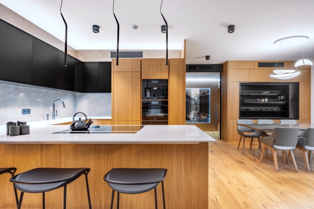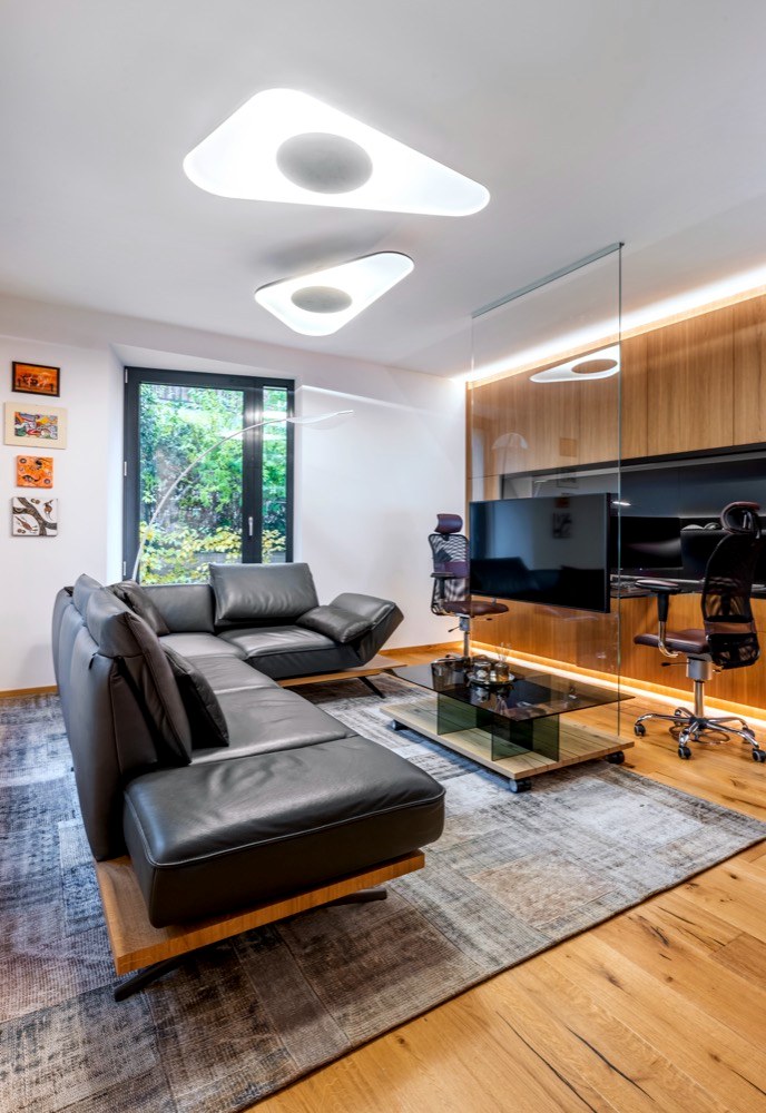Velmi rafinovaného řešení se dočkal pracovní kout. „Pracovnu jsme se rozhodli vyřešit optickým trikem. Na skleněnou příčku jsme zavěsili televizi a za ni jsme schovali dvě pracovní místa. Je to takové netradiční, ale velmi vzdušné řešení.“ Díky tomu jsme zachovali dostatečný prostor jak pro nezbytnou pohovku, tak pro jídelnu s až osmi místy a kuchyňskou linku s neopomenutelnou vinotékou.