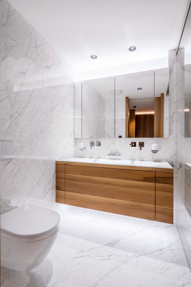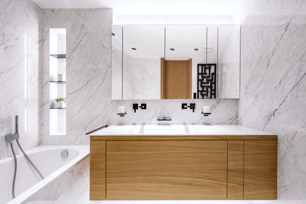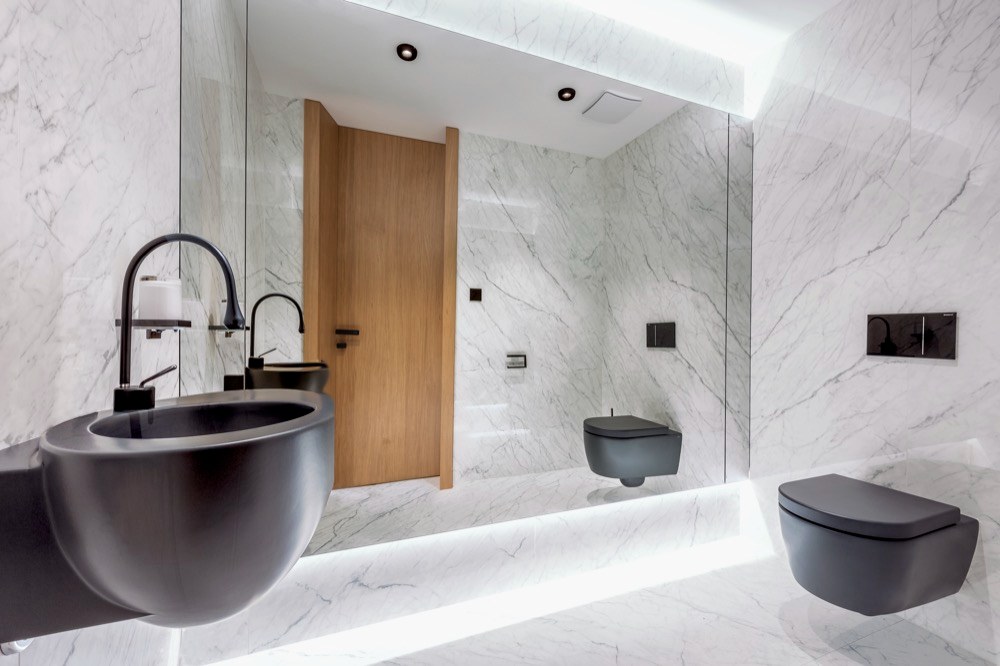 Na užitnou plochu 120 m2 se vešlo všechno, co si rodina mohla přát – dva dětské pokoje, ložnice, vstupní hala, dvě koupelny, toaleta i obývací prostor s pracovním koutem, jídelnou a prostornou kuchyní. A protože už měl klient s prací studia osobní zkušenosti, rozhodl se v tomto případě dát autorům volnou ruku. „Chtěli jsme respektovat historickou podstatu objektu a snažili jsme se jedinečnou atmosféru promítnout i do interiéru – ovšem v moderní formě, aby bydlení plně odpovídalo potřebám současné rodiny,“ nastínil autor. Do popředí se dostaly přírodní tóny dubového dřeva, které prostupují skutečně celým interié-rem. V privátní ložnicové části se pak k dubu připojila i dýha z vlašského ořechu. Oproti klasickému zámeckému principu práce se dřevem se však architekt rozhodl pro odlišnou a o poznání modernější techniku skládání dýhy. Na ložnici plynule navazuje jedna ze dvou elegantních koupelen vyvedených v bílém mramoru s jemnou kresbou. Svěží dojem jemně doplňuje nenápadný sprchový kout a dýhovaná komoda pod umyvadlem. Druhá koupelna v bytě se drží stejného principu, sprchu však nahradila vana a skříňku z ořechu zase poctivý dub. Osvědčené podobě se nevymyká ani samostatná toaleta u vstupu – ta se však dočkala designové keramiky v hedvábně černé, která se těší oblibě především u dětí.