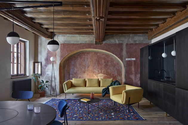 Právě k rekonstrukci prvního patra domu přizvali architekty ze studia ORA. Ty projekt zaujal i kvůli přístupu investorů, jejichž životní styl také ve svém řešení v prostoru otiskli. Po stavební stránce bylo zásadní odhalit a zachovat původnost domu. Apartmánu o rozloze 80 m2 dominuje hlavní obytný prostor s vyřezávaným renesančním stropem: „Místnost byla druhotně rozdělená příčkou.