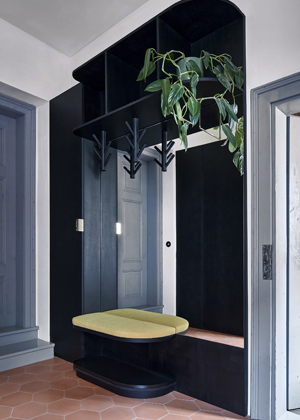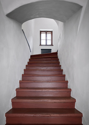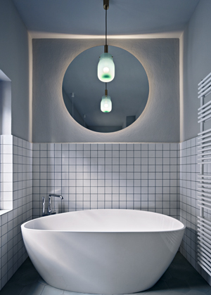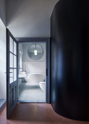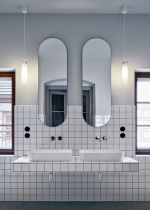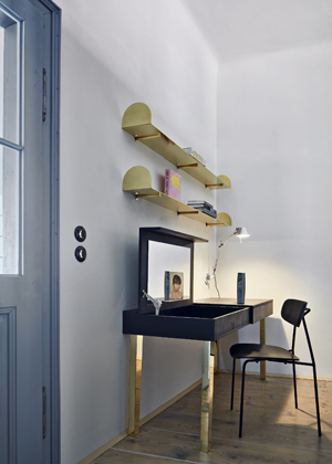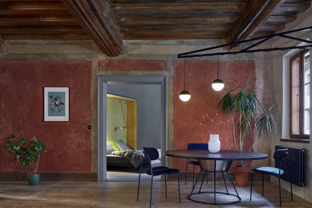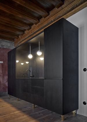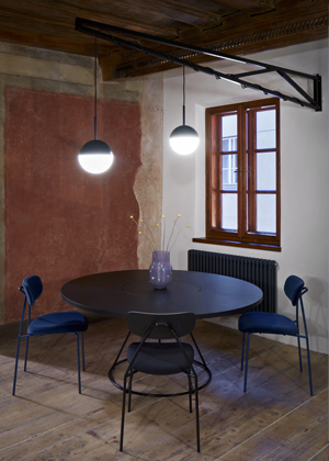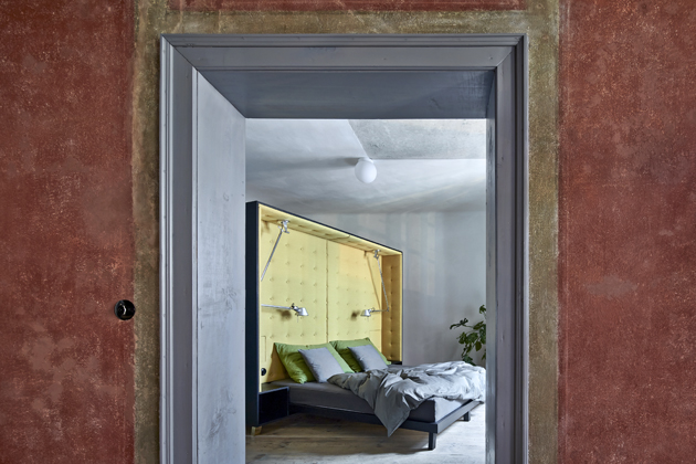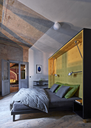 Postel spojená se skříní stojí vprostřed místnosti a natáčí se ke světlu a k původním výmalbám. Spáč je směřován k pozorování detailů povrchu,“ doplňují architekti, kteří pro nábytek vyrobený na míru zvolili temně mořenou březovou překližku. Nábytek i osvětlení jednoznačně odrážející současné tendence v oblasti designu a architektury se zde setkávají s prostorem, jehož znovuobjevené půvaby určují charakter celého projektu. Výsledkem je veskrze přátelský dialog, ve kterém je každému dobře.
