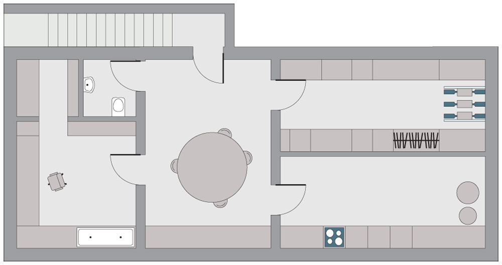 Dům je podsklepený. V suterénu, kam se vchází odsunovací terasou, se nacházejí technická místnost, společenská místnost, fotokomora a sklad. Pro naplnění touhy klienta trávit venku co nejvíce času i za deště má dům terasu pod střechou po celém svém obvodu. Jeho střecha je přikryta zeleným kobercem, aby co nejlépe splývala s přírodou, a dům tak byl zároveň i izolován.
