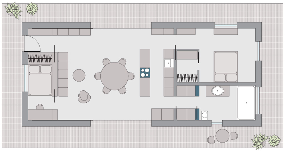 Dům je koncipován jako dva perforované kameny, mezi nimiž vzniká volný prostor. Vše je ukryto pod deskou. Na obytný prostor navazují dvě ložnice s koupelnou a vstup do domu. Okna v obytném prostoru se zasouvají do předstěny v interiéru tak, aby bylo možné bezbariérově propojit interiér s exteriérem.