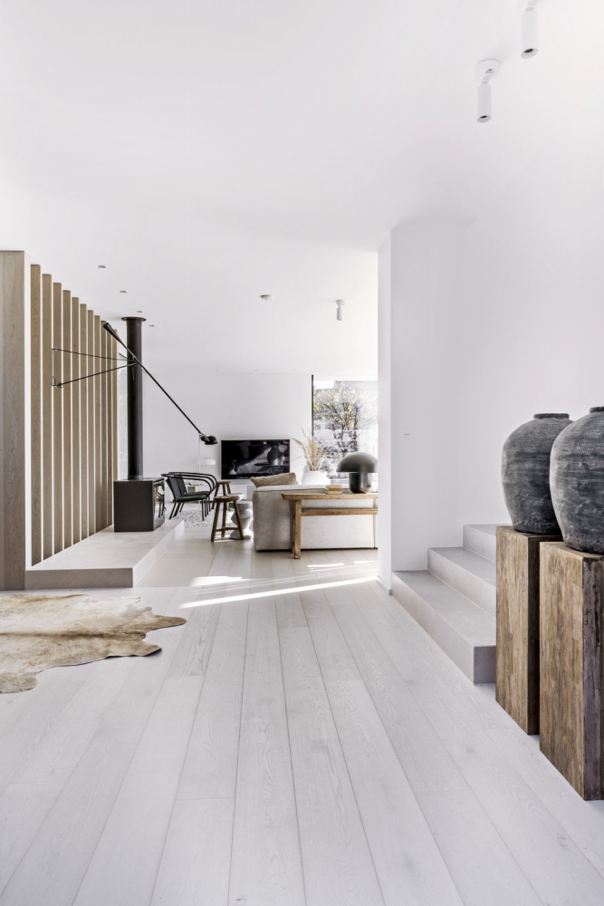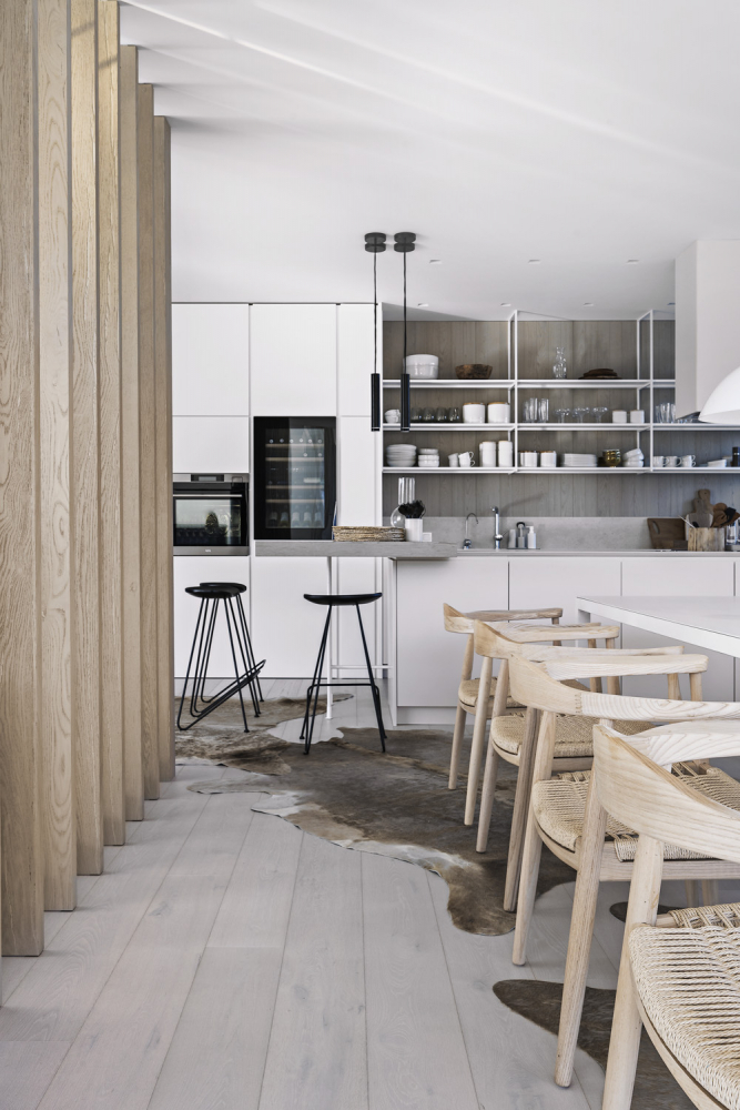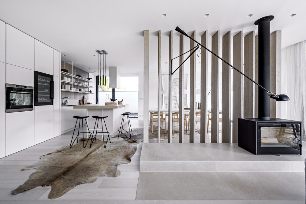 Nosná konstrukce mimořádně rozlehlého otevřeného celku s obývacím pokojem, jídelnou a kuchyní je skryta v rafinovaném prvku z dřevěných lamel, který ho zároveň i atraktivním způsobem člení. Obývací prostor si tak zachovává jistou část intimity. Téměř padesát metrů čtverečních velká obývací zóna je smysluplně členěna na funkčně různorodě využitelné ostrůvky. Záměr podporuje i sedací nábytek s rozdílnou hloubkou sedu. Na prostor není skoupá ani jídelna se stolem, kam se příležitostně posadí deset i více osob, a kuchyň s barovým stolem pro čtyři lidi.