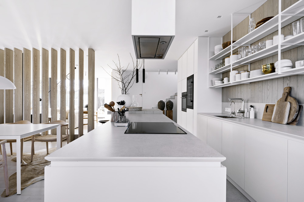 Dostatečné množství uzavřených úložných prostorů v kuchyni umožnilo ponechat místo nad pracovní deskou otevřené a umístit sem jen poličky. Kuchyň tak získala více obytný charakter. Přímo z ní lze vstoupit do místnosti určené pro domácí práce, kde našly místo pračka se sušičkou a další dřez, a na ni ještě navazuje nevytápěná, odvětrávaná spíž. Protilehlou stranu z venku tvoří venkovní kuchyň umístěná v nice terasy. Po schodech ve středu domu a z mezipodesty mohou domácí zamířit do sauny či tzv. hobby místnosti, kde je možné si zacvičit nebo si pohrát s vláčky.