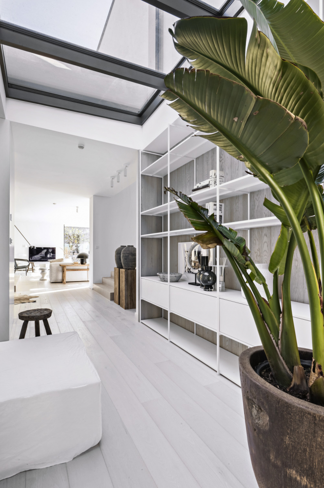 Rozlehlý prostor přízemí domu je od vstupního zádveří oddělen prosklenými dveřmi. Vzdušnost navazující chodby podporuje také stropní prosklení, které zajistilo srdci domu přísun přirozeného denního světla. Vstoupit do domu je však možné i samostatným vchodem z garáže. Architekt se musel vypořádat s poměrně úzkým pozemkem, proto je prostorově náročný dům navržen jen s minimálním odstupem tří metrů. Některé obvodové stěny stavby tvoří současně i plot, který je součástí východní terasy a proskleného atria s mimořádnou, velmi intimní atmosférou.