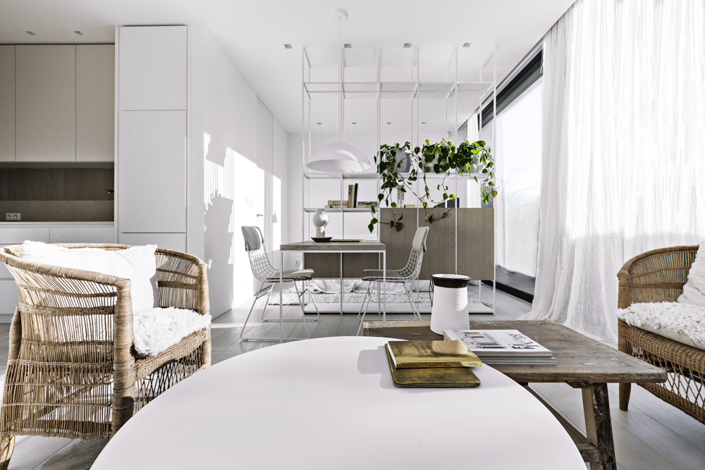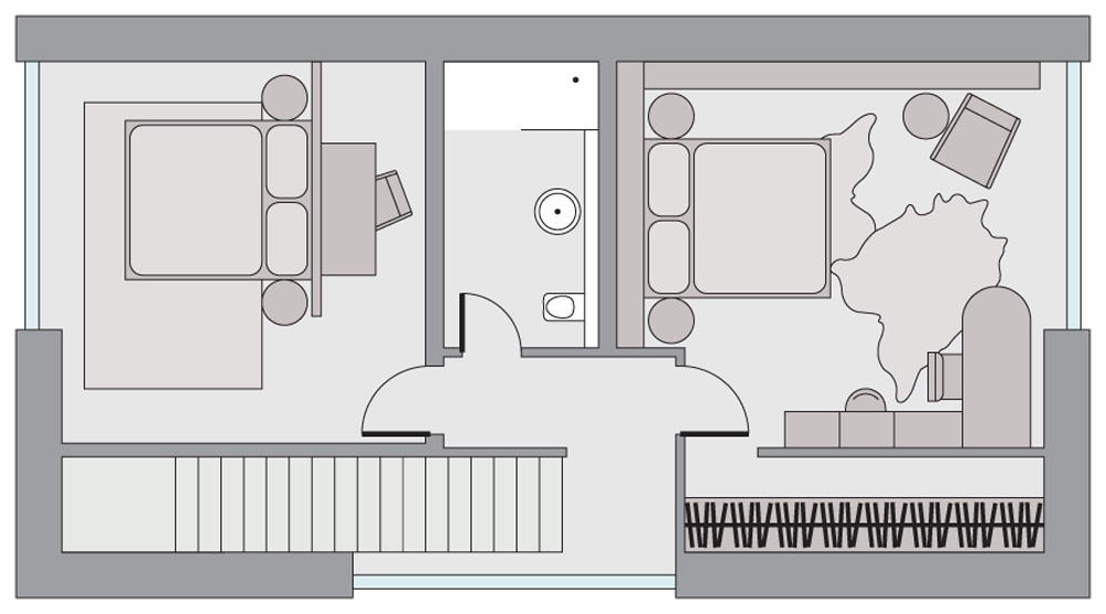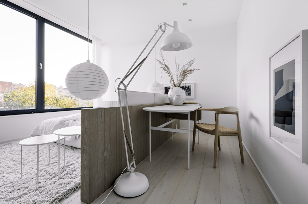 Apartmán je hodně světlý, ze západní strany prosklený se vstupem na terasu plnou zeleně. Je zcela otevřený, ložnici od obývací části odděluje jen ocelová konstrukce s poličkami, na níž je kotven jídelní stůl pro dva a zavěšen televizor. Nechybí mu ani vlastní koupelna a kuchyň.