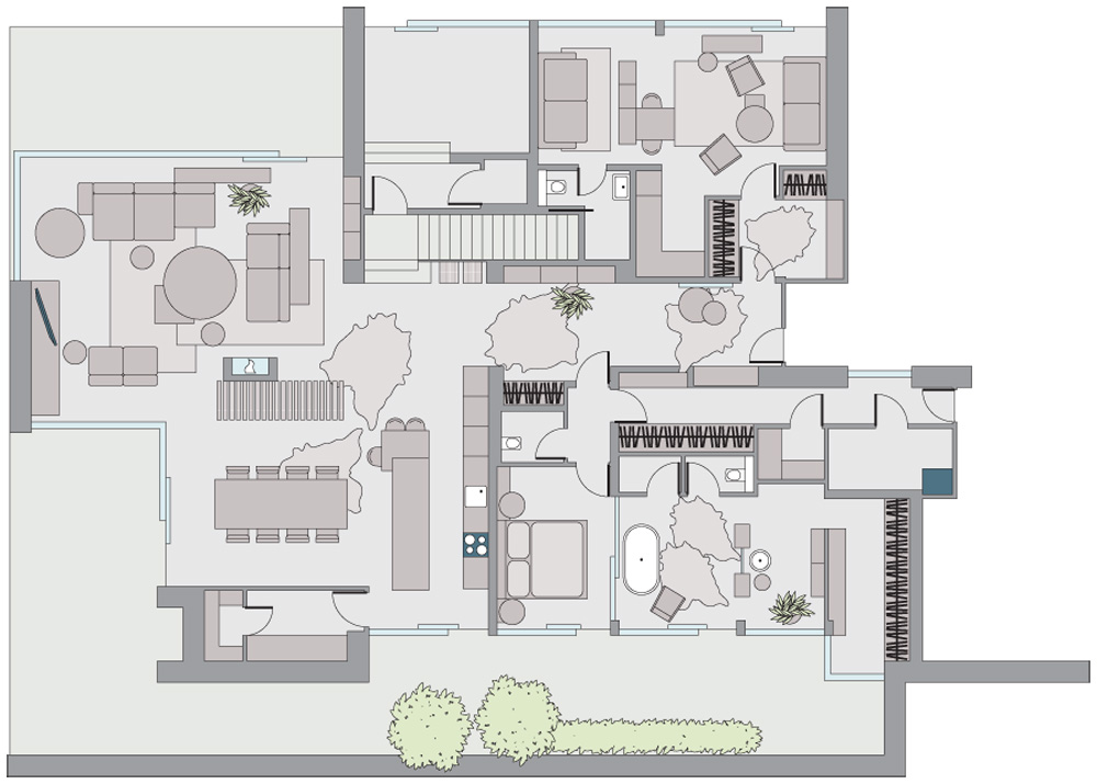 Přes skleněnou stěnu vnímáte obvod místnosti až venku, na hranici atria a současně i pozemku. Jakoby vám v místnosti rostly stromy... Sem vede cesta z kuchyně, ložnice manželů i z velké koupelny. Ta je nábytkem efektně členěna na koupenu dámskou a pánskou. Na ni navazuje velká šatna. Terasa se objevuje také na jižní straně domu a navazuje přímo na jídelnu, další je pak situována západním směrem. Zde je také umístěn bazén. Aby se hojně prosklený dům nepřehříval, jsou jižní a západní terasa nadstřešené.