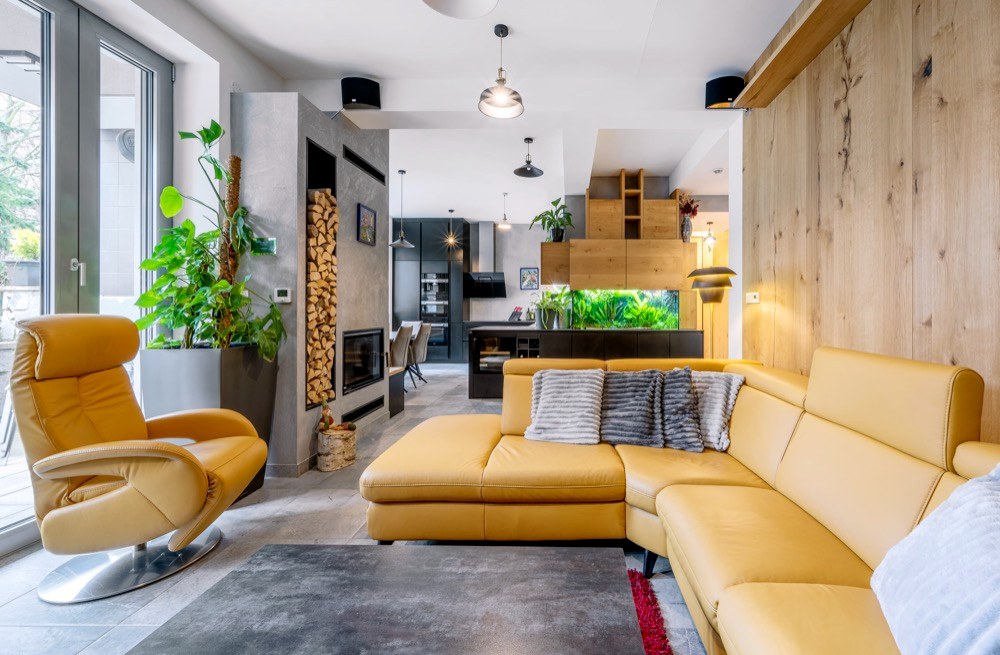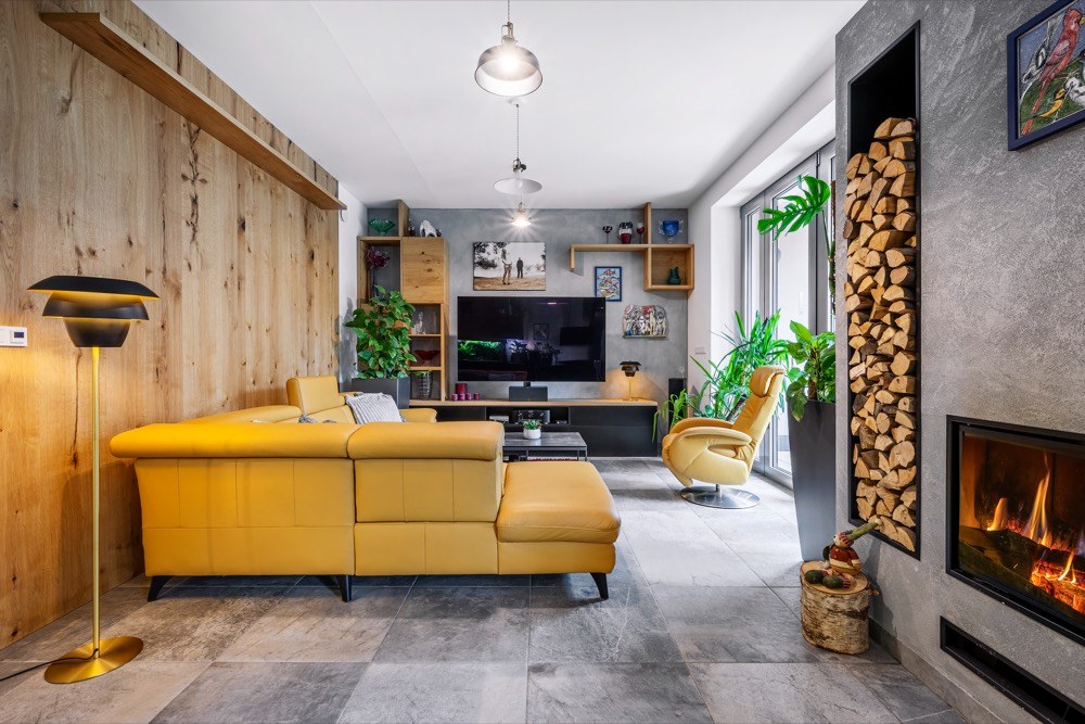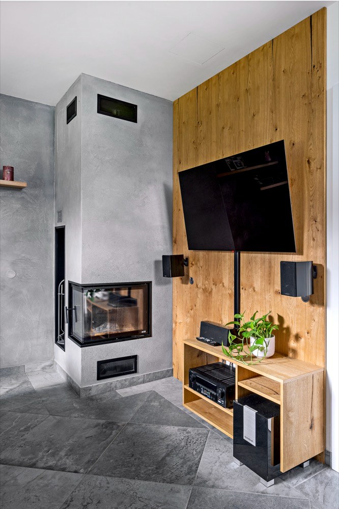Kombinace matné černé a světlého dubového dřeva se prolíná i do dalších částí domu. Protože šedá velkoformátová dlažba působila na majitele příliš chladně, přáli si, aby se obývací část nějakým způsobem opticky zateplila. Proto jim designérka navrhla obložení některých stěn dýhou, která je použita i na nábytku. Stejné barevné řešení má i pracovna, do které si majitel přál zakomponovat vitríny na ukládání svých sbírek. Při zařizování této místnosti bylo třeba počítat s velkými překlady, kterým návrhářka přizpůsobila horní linie nábytku. Odpočinkovou část s pohovkou lemují knihovny s výklopnými dvířky, které celkové řešení sjednocují.