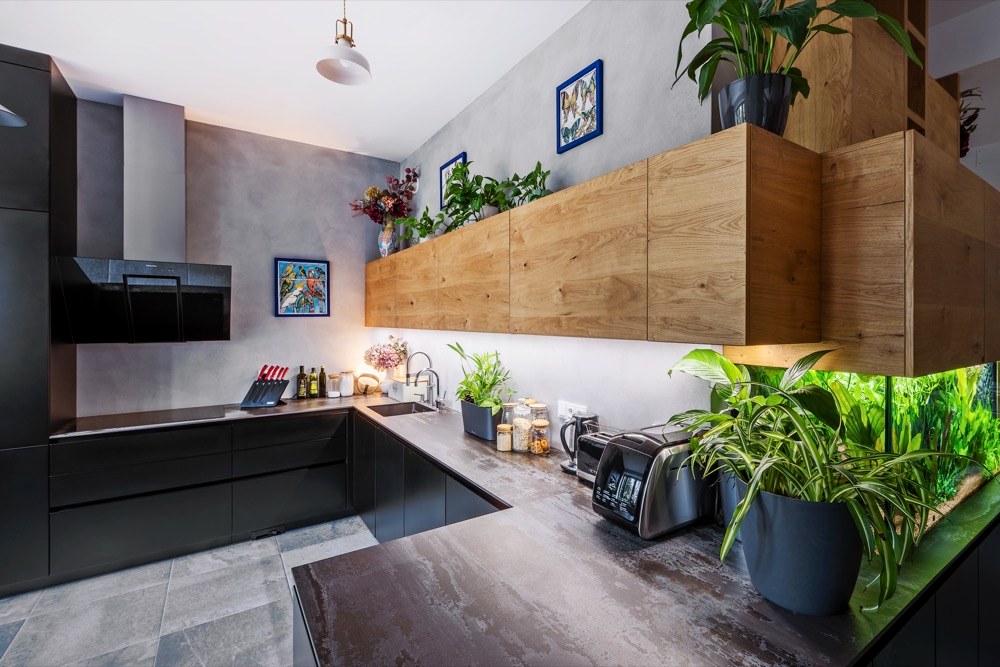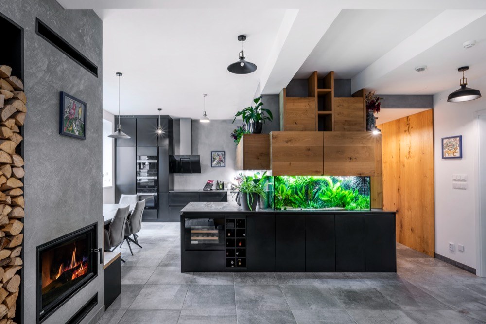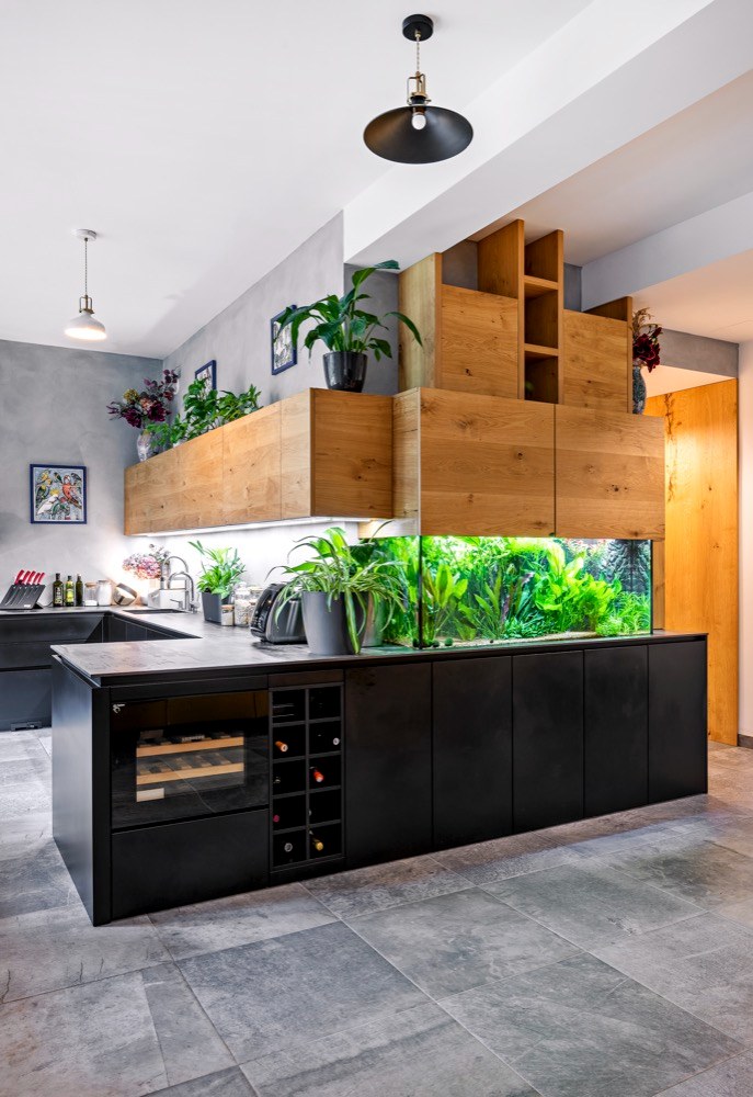 Atypickou součástí kuchyně je akvárium, které si přál do sestavy zakomponovat majitel. Návrhářka se ale musela vypořádat s požadavkem, aby byl písek v akváriu ve stejné úrovni jako pracovní deska a aby v jeho horní částí nebyl viditelný poklop, nýbrž jen skleněné stěny. Pro tento účel vymyslela skrytou kovovou konstrukci, ve které se našlo místo i na ukládání akvaristických pomůcek. Krycí prvek působí nevšedně a z pohledu od obývací části vypadá, jako by levitoval. Celé provozuschopné řešení se podařilo vytvořit také díky možnostem společnosti JN Interier, která je vzhledem k vlastní výrobě schopná pružně reagovat i na zcela atypické požadavky.