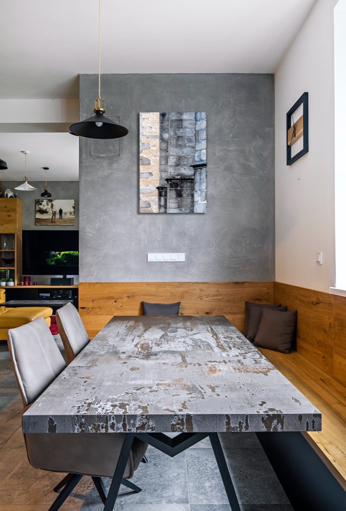 Černá barva se světlým dřevem vypadá elegantně a vyniká zejména v kuchyňské části, kde jsou tmavé plochy nábytku nejmarkantnější. Tuto kombinaci doplňuje šedivá barva použitá na pracovní desce, na desce jídelního stolu, na dlažbě a na některých stěnách. Dýhované a černé plochy kuchyňského nábytku pohledově neruší úchyty, které jsou zafrézované do korpusu. Na pracovní ploše kuchyně je použitá keramická deska s elegantní tloušťkou 1,2 cm a stejný dekor má i silnější deska na jídelním stole.