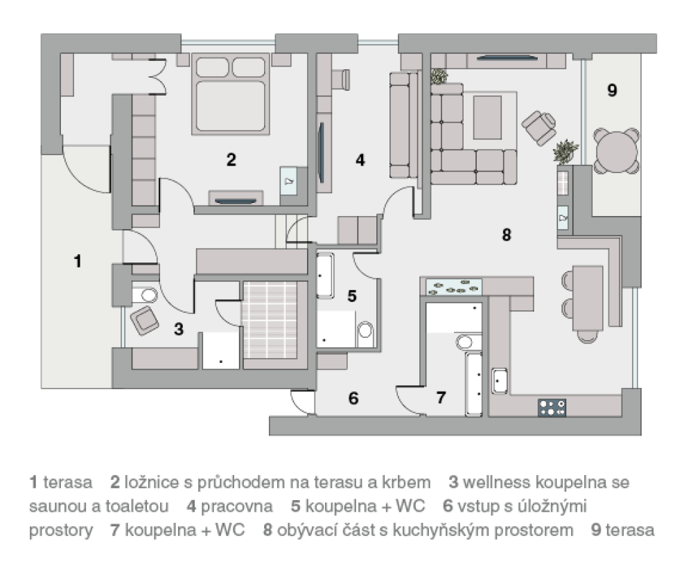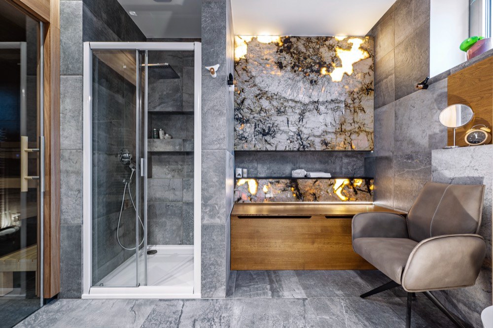 V novém objektu mají majitelé k dispozici dvě koupelny – běžnou a relaxační, které dominuje podsvícený kámen Patagonia. Pod ním je masivní lavice s úložným prostorem, která je namořená do stejného odstínu, jako má dřevo použité v sauně. Pohodu při odpočinku tu umocňuje intimní světlo z podsvíceného kamenného obložení.