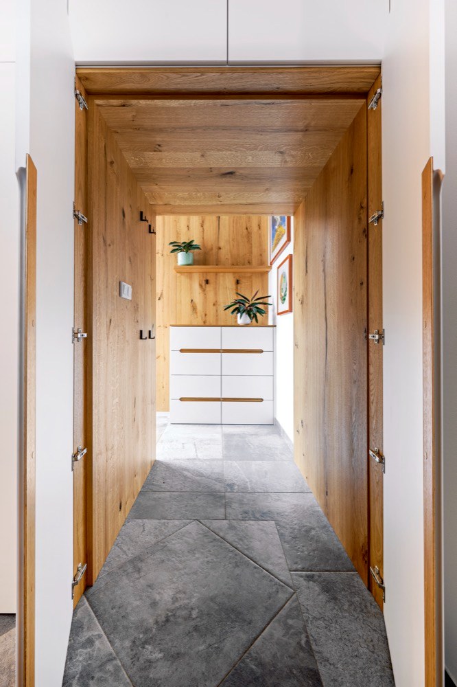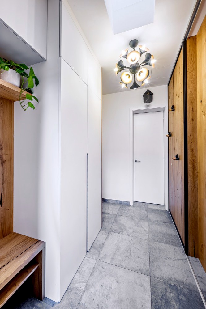 Požadavek dostatku úložných prostor se podařilo splnit velkou skříní v chodbě a několika předělovými prvky. Bíle lakovaný nábytek oživují úchyty z dubové překližky. Další úložné prostory poskytuje sestava skříní v chodbě u ložnice.