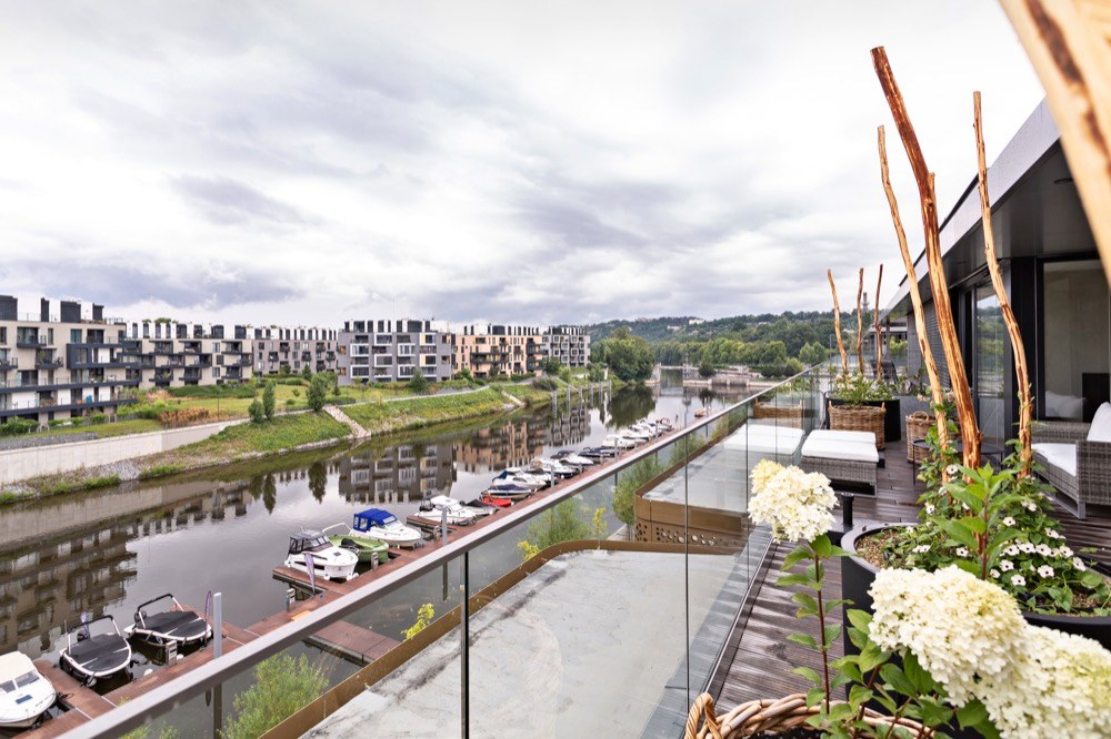 Sto deset metrů čtverečních velký byt třípatrového domu s garážemi pod úrovní země a prostornou terasou nadchl manžele nejen luxusní lokalitou u slepého ramene řeky Vltavy, ale také pro možnost ukotvení lodi přímo u domu. Záměrem bylo vytvořit vzdušný byt s bydlením pro tři kočky a naplnit i jednotlivá konkrétní přání majitelů. Manželé si přáli získat funkční, moderní, útulný byt a terasu, kde by mohli trávit co nejvíc času. Zadání zahrnovalo nejen vytvoření návrhů, ale i jejich kompletní realizaci. Studio MF art získalo volnou ruku, návrhy designérky prošly jen drobnými úpravami. Dispoziční uspořádání interiéru se neměnilo. Hned na začátku však bylo třeba upravit veškeré rozvody elektřiny a vody. Domácnost je ovládána inteligentním systémem.