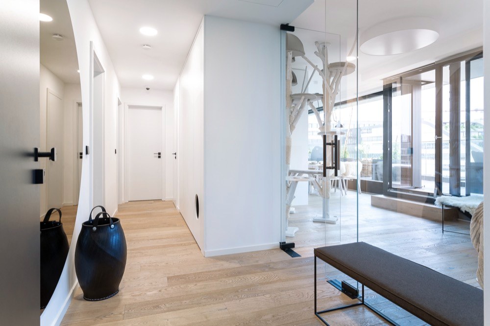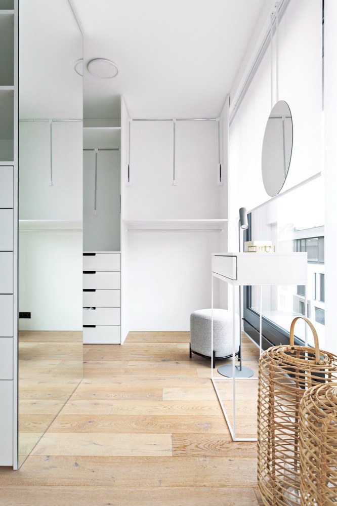 Vše bylo třeba uzpůsobit životu s kočkami a vytvořit jim prostor na hraní, spaní i odpočinek. „Do jedné části mezi obývacím pokojem a kuchyní jsem navrhla velké kočičí stromy. Kočičí WC je ukryto v chodbě, kam vstupují otvorem ve dveřích skříně. Kromě přání barevné sedací soupravy manželé žádné specifické požadavky neměli,“ vzpomíná Markéta Fleischnerová. V interiéru bylo nezbytné vyřešit především úložné prostory. Pračku se sušičkou vložila do velké skříně v chodbě, stejně jako v ní vytvořila místo pro ukládání žehlicího prkna, tyčového vysavače, mopu apod. Šatnu designérka vytvořila z jednoho pokoje. Všechny svršky tak majitelé uklízejí přímo do skříně v šatně, v zádveří se tak nehromadí žádné kabáty ani bundy. Šatna je rozdělena na část určenou paní domu a polovinu patřící muži. Uprostřed je umístěn na míru vyrobený kosmetický stolek se zrcadlem zavěšeným na kovové tyče upevněné do stropu. Veškeré kabely v interiéru jsou očím neviditelné. Například na televizním stolku, kde je televizor a další technika v zásuvkách a našly tu místo i tři lampy, jsou všechny kabely ukryté v prostoru mezi zásuvkou a korpusem, celý nábytek je protkán průchodkami. Stejné je to i v komodách umístěných v ložnici.