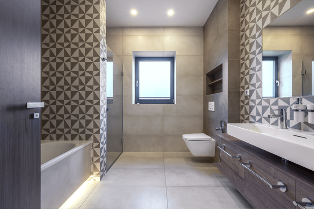 I když jsou obě koupelny stylově velmi podobné, liší se drobnými detaily, použitými barvami a dekorem na stěnách. Pro rodičovskou koupelnu byly zvoleny tmavší odstíny a stěny ozvláštňuje vzor, který vytváří trojrozměrný dojem. Dětskou koupelnu v současnosti prozradí několik hraček, které si děti berou do vany. Ze samotného zařízení ale není jasné, pro koho je určena, takže až povyrostou, budou mít k dispozici moderní a decentně zařízený prostor.