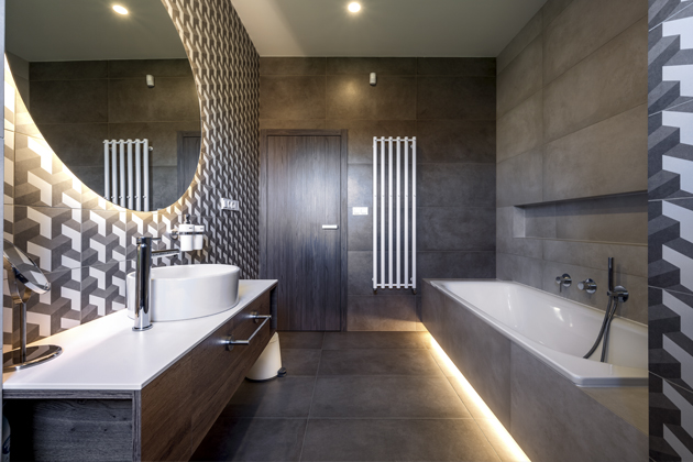 V obou koupelnách hrají důležitou estetickou i praktickou funkci niky, které vznikly nutnými přizdívkami u toalety, vany a ve sprchovém koutě, kde slouží k odkládání hygienických potřeb. Zajímavě si návrhář poradil i s instalací van, které se kvůli přizdívce musely posunout víc do prostoru. Aby výsledek působil vzdušněji, odlehčil celé řešení tak, že nechal u obezdívky vany nad podlahou malý prostor, takže vany působí, jako by se vznášely. Levitační efekt ještě umocňuje LED podsvětlení, které osvětluje také niky.