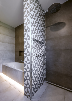 V novém domově si majitelé přáli vlastní koupelnu, která bude umístěná hned u ložnice, a samostatnou koupelnu pro děti, jež bude příležitostně sloužit také pro návštěvy. Pro koupelny byly v domě vyčleněné prostorné místnosti, takže si v obou mohli dovolit velkorysejší řešení s vanou i sprchovým koutem.
