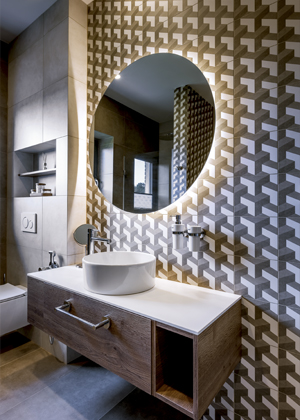 Do návrhu architekta se promítla zkušenost s tím, že děti chtějí užívat věci přímočaře a jen málokdy jsou ochotny ukládat věci pouze na určené místo a dávat při tom pozor, aby se nic nepocákalo. Proto zvolil atypickou instalaci skříňky pod umyvadlem níž, než je běžné, takže její deska nesvádí k odkládání. Místo toho mají děti k dispozici dvojumyvadlo s dostatečně velkým volným prostorem, který se k položení věcí nabízí jako první. V koupelně pro rodiče se mohl návrhář víc zaměřit na designovější řešení, takže sem zvolil kulaté umyvadlo položené na desce, s jehož tvarem koresponduje podsvícené kruhové zrcadlo. Z praktických důvodů je tu na nábytku z masivu položená deska z umělého kamene.