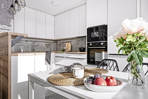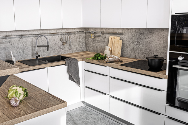K designu mapy zvolil architekt vinylovou podlahu Meister se vzhledem šedého kamene, jehož tónování se objevilo i na obkladu kuchyně v imitaci betonu. Na výrobu kuchyňské linky bylo použito lamino značky Egger v bílém provedení, které doplnila pracovní deska v dekoru dub Halifax. Vše zvýraznily do horní hrany zafrézované úchytové lišty v černém matném laku, které se krásně doplňují s černými spotřebiči a s dalšími doplňky.