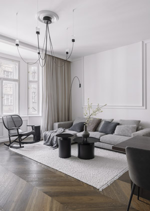 Byt situovaný v nově zrekonstruovaném domě se pyšní prostornou dispozicí 4+kk. Návrh interiéru zahrnoval i drobnou dispoziční úpravu, která spočívala ve zvětšení hlavního obytného prostoru s kuchyní a vytvoření šatny v zádveří. Zadání vyžadovalo tvarově čistý a barevně teplejší interiér, který by se stylově přiblížil belgickým interiérům. „Náš původní záměr byl orientován na přísnější tvary, asymetrii a technické prvky v kontrastu s původními prvky klasického vinohradského bytu,“ vzpomíná na zakázku architektka Klára Valová a pokračuje: „V návrhu jsme šly cestou přírodních a pocitově jemných materiálů.