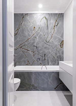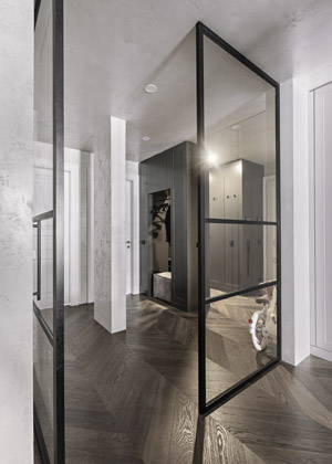 Barevná kombinace dává prostoru jemnost a eleganci a zároveň i přísnost v tmavě šedém nábytku v kombinaci s ocelovými prvky. Kuchyně je pocitově vyčleněna z hlavního obytného prostoru pomocí sníženého stropu a svým materiálovým provedením navazuje na halu, s níž je spojena právě pomocí velkých skleněných dveří v černém rámu. Z hlavního obytného prostoru lze vstoupit do ložnice majitele. Nejprve se však prochází šatnou, která svým provedením částečně navazuje na provedení kuchyně.