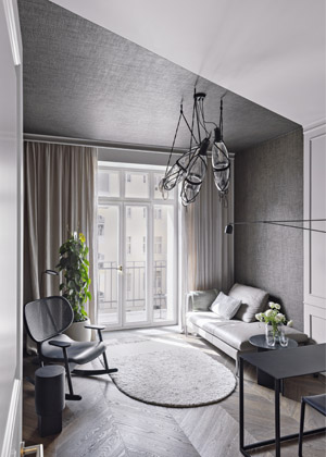 Cílem návrhu bylo skloubit tradiční prvky vinohradského bytu s moderními nadčasovými materiály, jako je dřevo, kámen a ocel, a doplňky v zemitých tónech, čímž autorky dosáhly útulné atmosféry. Barevné řešení bytu vychází také z faktu, že nyní je byt převážně pánským. Architektky zde pracovaly s odstíny šedé barvy, s tmavým kamenem, tmavě mořenou dubovou dýhou na nábytku a dřevěnou podlahou, která svou skladbou navazuje na historické vzory. „Klient nám na začátku specifikoval několik hlavních požadavků, s nimiž jsme v návrhu pracovaly. Mezi ně patřilo například vytvoření prostoru pro obrazy nebo pánskou pracovnu pro posezení s přáteli. U dětského pokoje pak byla požadována funkčnost v návaznosti na Montessori principy a samozřejmě i dostatek úložných prostor,“ přibližuje vývoj zrodu interiéru architektka.