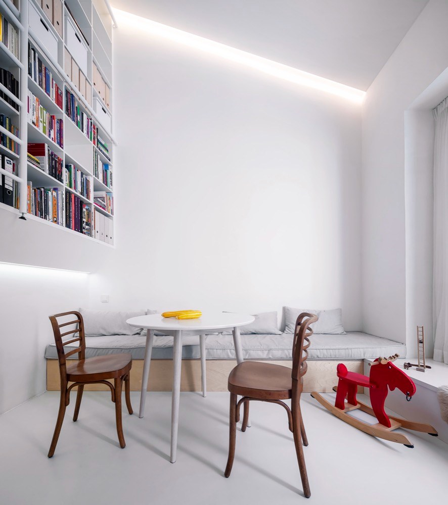 V mezonetu bez nejmenších debat panuje strohý severský minimalismus soustředěný na funkční povahu zvolených řešení – za vše mluví světle šedá PUR stěrka na podlaze celé spodní úrovně, březová překližka jako pochozí vrstva ložnicového patra či světle šedý kaučuk na podlaze i exponovaných stěnách hlavní koupelny. Naprostá většina nábytku i schodiště pochází ze zakázkové výroby, díky které bylo možné přesně vyhovět potřebám jednotlivých prostor, a to za využití bílého laku a březové překližky. Dokonale minimalistický dojem pak dokreslují otočné i posuvné dveře se zcela skrytou zárubní. Strop nenápadně rámuje nepřímé osvětlení, které vizuálně nijak nenarušuje koncept bytu a naopak elegantně umožňuje nerušeně vnímat vzdušnost hlavní místnosti v celé její výšce. I textilie napříč celým bytem drží vizuální linku s vybavením – polstrování v šedé barvě si skvěle rozumí se závěsy z bílého lnu, a společně tak podtrhují surový půvab prostorově působivé bytové realizace.