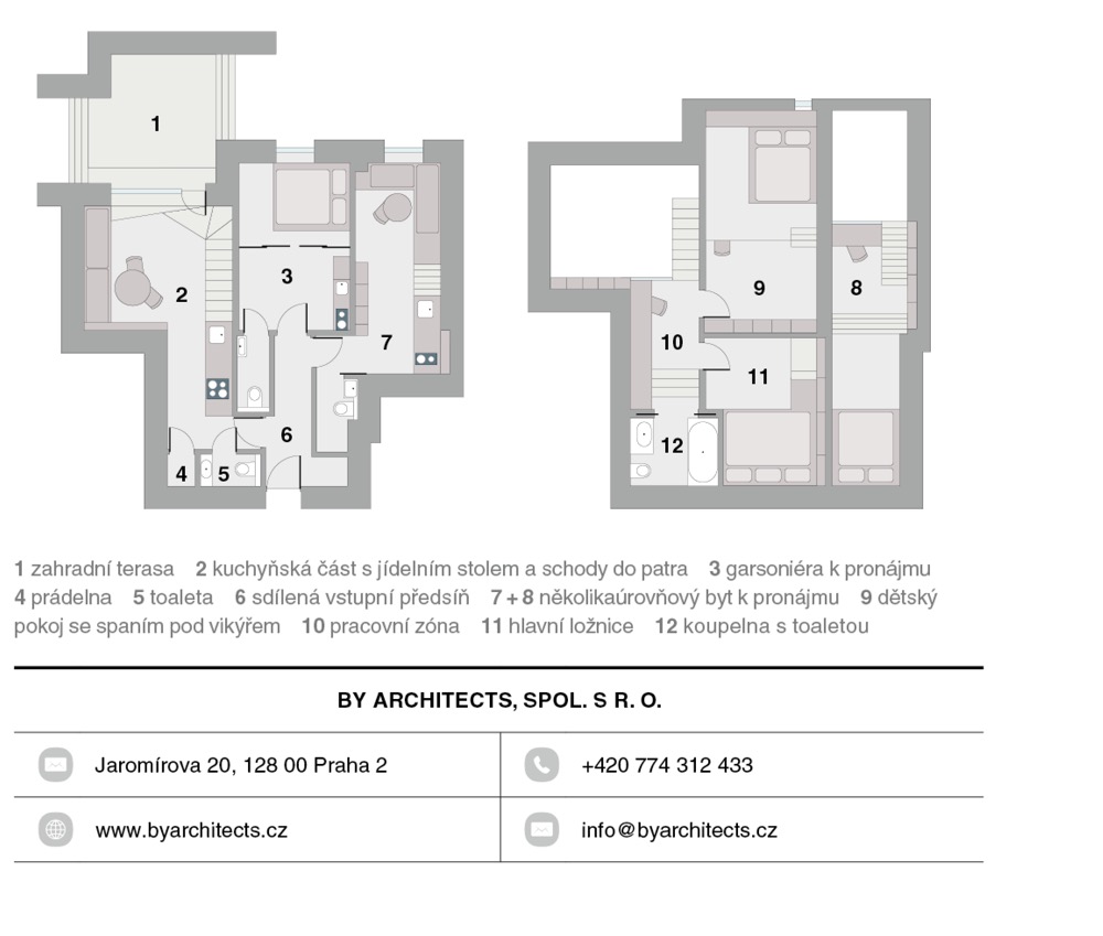 Část obývaná rodinou majitele je typická netradičním vrstvením prostoru. To si vyžádalo vznik celé řady nápaditých řešení i nanejvýš rafinovaný systém úložných míst. Na spodní úrovni byt disponuje toaletou i malou prádelnou, do které vede prakticky neviditelný shoz na prádlo z horního podlaží. K tomu nejnižší patro poskytuje prostor také pro kuchyň s malou spižírnou a obytný prostor s rozměrným oknem a dveřmi vedoucími na venkovní modřínovou terasu. Zakázkové schodiště autoři konceptu promysleli tak, aby sloužilo nejen jako spojnice s vyšším patrem, ale také jako potřebný stupínek pro výstup ven. Vyšší patro každého v první řadě uvítá nápaditou pracovnou umístěnou přímo na galerii, ze které je pak možné pokračovat dál do hlavní koupelny, ložnice a dětského pokoje se spacím patrem ve vikýři.