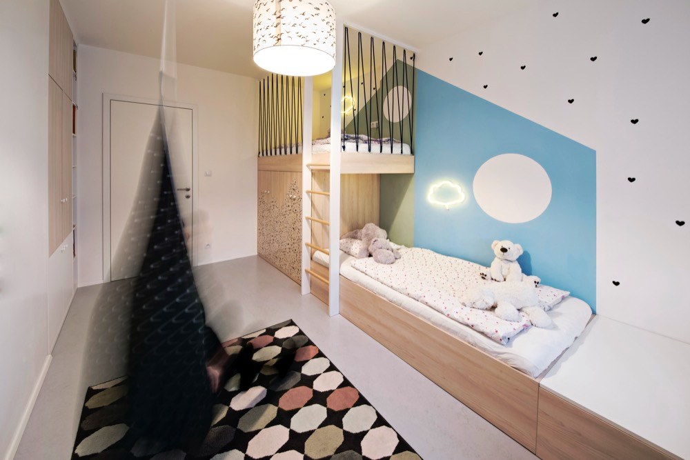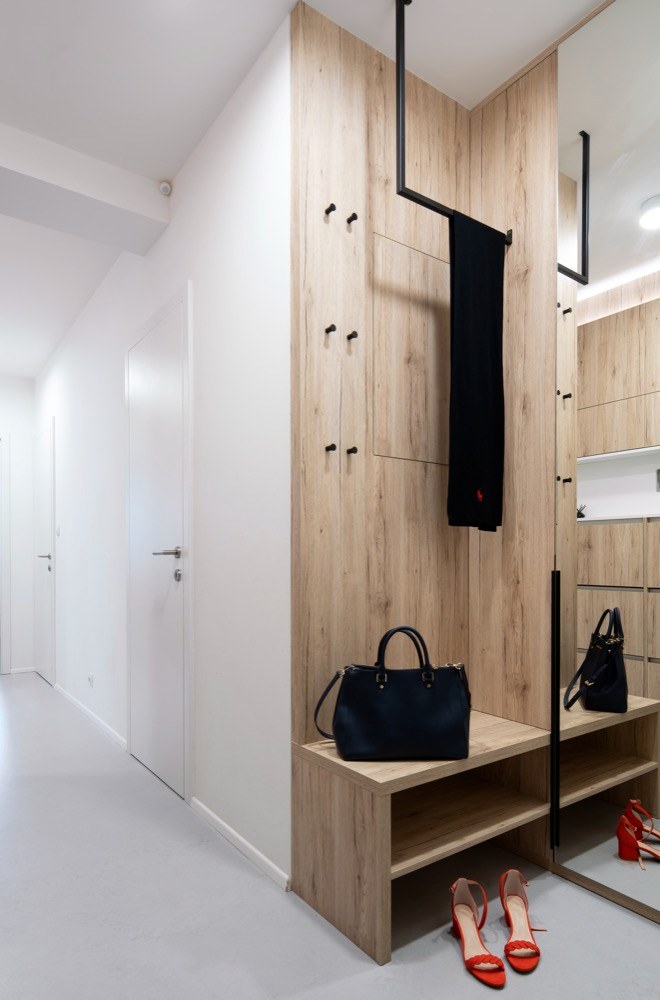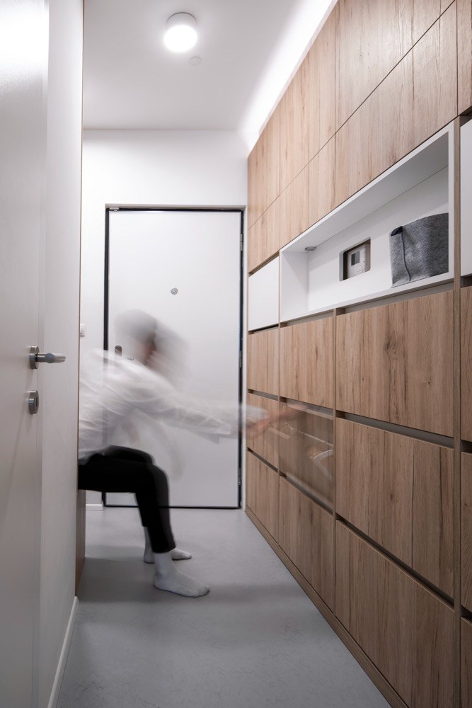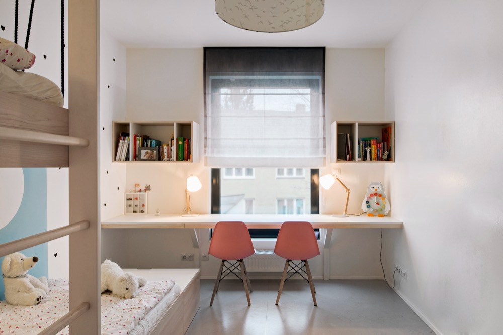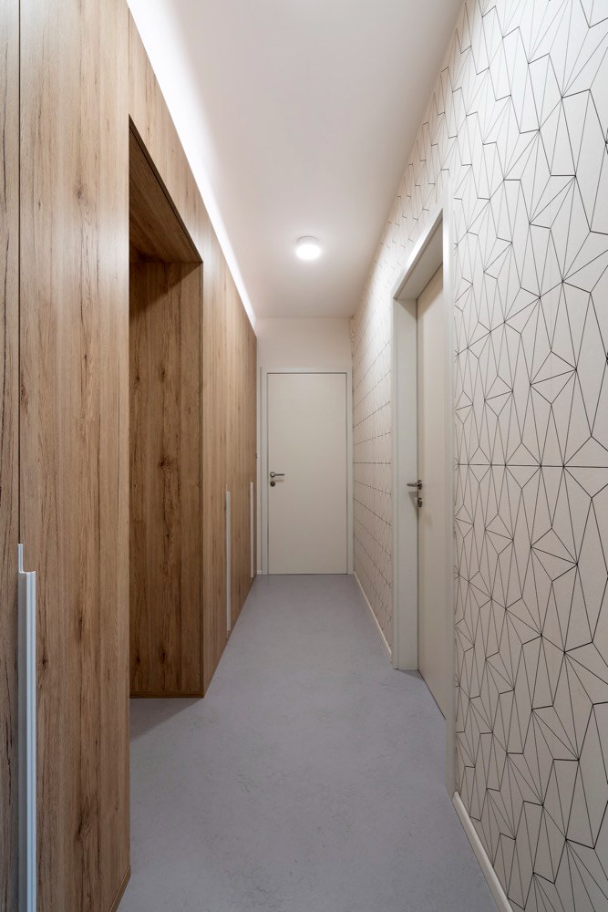 Zasáhnout do dispozice již nebylo možné a velikost ložnic byla opravdu limitující. Požadavek na velkorysé úložné prostory designéři vyřešili pomocí vestavného nábytku s jemnou strukturou dřeva. Kuchyňský kout je zapuštěn v integrovaném bloku nábytku, vestavěné skříně jako bonus, se kterým se v původní dispozici developera vůbec nepočítalo, tvoří koridor mezi jednotlivými místnostmi. Maximalizován je úložný prostor v ložnici a dětském pokoji. Jeho prostorové řešení bylo skutečným oříškem – díky na míru řešenému nábytku se podařilo na pouhých 13 m2 vytvořit útulný a praktický prostor pro dvě malé školačky. Nejvíce změn provedli designéři v obývacím pokoji, což mělo vliv na elektroinstalaci, neboť zasahovali do kompletně dokončeného bytu. Jedním z přání klientů byl velký stůl pro osm lidí. Účelným řešením se stala variabilní rozkládací verze, která zároveň slouží jako dělící element mezi kuchyní a oddechovou částí. Majitelé si přáli vytvořit dvě pohodlná pracovní místa. Plnohodnotný dvoumístný pracovní stůl vizuálně navazuje na obývací kout a tvoří zde kompaktní prvek. Do promyšleného prostoru se vešla celá řada detailů a doplňků. Některé z nich dodali v souhře s celým interiérem sami majitelé. Osobnost majitelů se propsala i do dekorativní zdi se závěsnými rostlinami.