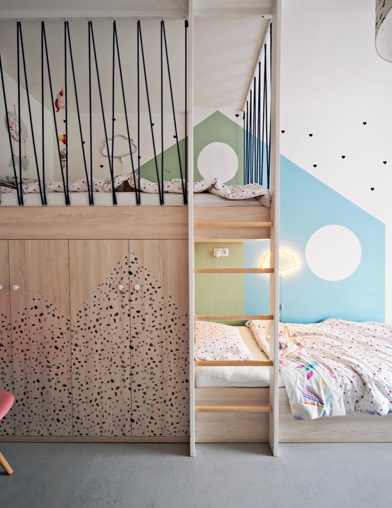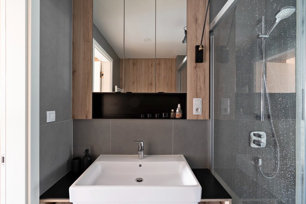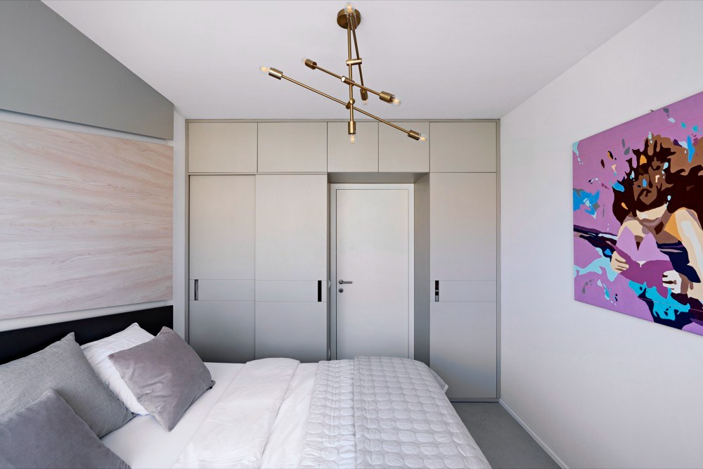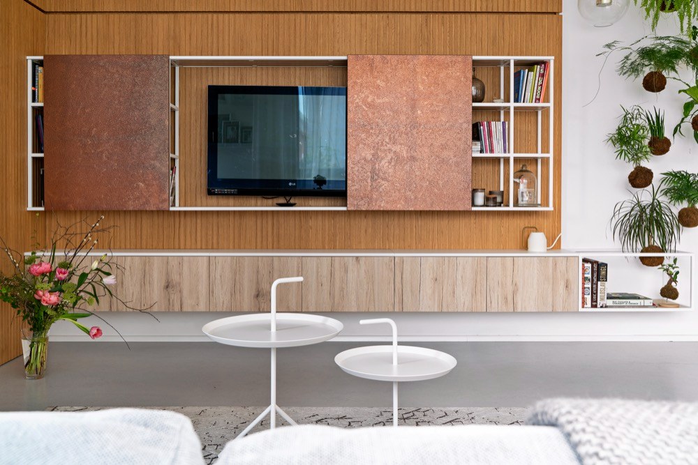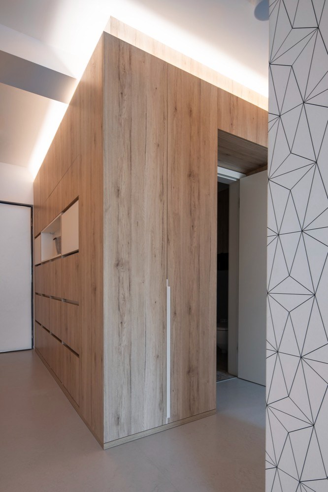 Zasáhnout do dispozice již nebylo možné a velikost ložnic byla opravdu limitující. Požadavek na velkorysé úložné prostory designéři vyřešili pomocí vestavného nábytku s jemnou strukturou dřeva. Kuchyňský kout je zapuštěn v integrovaném bloku nábytku, vestavěné skříně jako bonus, se kterým se v původní dispozici developera vůbec nepočítalo, tvoří koridor mezi jednotlivými místnostmi. Maximalizován je úložný prostor v ložnici a dětském pokoji. Jeho prostorové řešení bylo skutečným oříškem – díky na míru řešenému nábytku se podařilo na pouhých 13 m2 vytvořit útulný a praktický prostor pro dvě malé školačky. Nejvíce změn provedli designéři v obývacím pokoji, což mělo vliv na elektroinstalaci, neboť zasahovali do kompletně dokončeného bytu. Jedním z přání klientů byl velký stůl pro osm lidí. Účelným řešením se stala variabilní rozkládací verze, která zároveň slouží jako dělící element mezi kuchyní a oddechovou částí. Majitelé si přáli vytvořit dvě pohodlná pracovní místa. Plnohodnotný dvoumístný pracovní stůl vizuálně navazuje na obývací kout a tvoří zde kompaktní prvek. Do promyšleného prostoru se vešla celá řada detailů a doplňků. Některé z nich dodali v souhře s celým interiérem sami majitelé. Osobnost majitelů se propsala i do dekorativní zdi se závěsnými rostlinami.